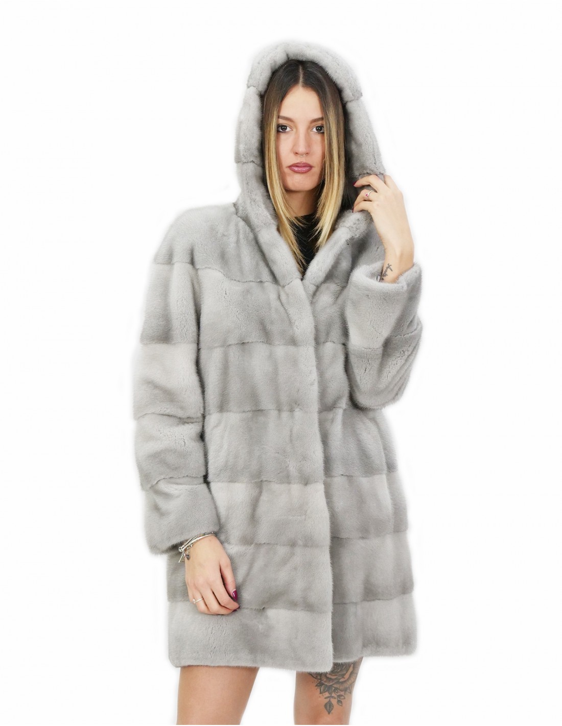 Mink jacket with whole skins in horizontal processing. Our mink furs are productions made in our laboratories, therefore a unique and exclusive mink jacket. The possibility of producing our highest quality furs allows us to make proposals at different prices with various opportunities at low prices that are always available. Furthermore, our laboratories and our collaborations guarantee a mink fur of undisputed quality 100% made in Italy. The quality of female mink fur used for this is a mink fur jacket with skins signed InModa Pellicceria. The 84 cm long horizontal mink fur jacket has external pockets, internal drawstring at the waist, hook closure and hood lined in sapphire mink fur.