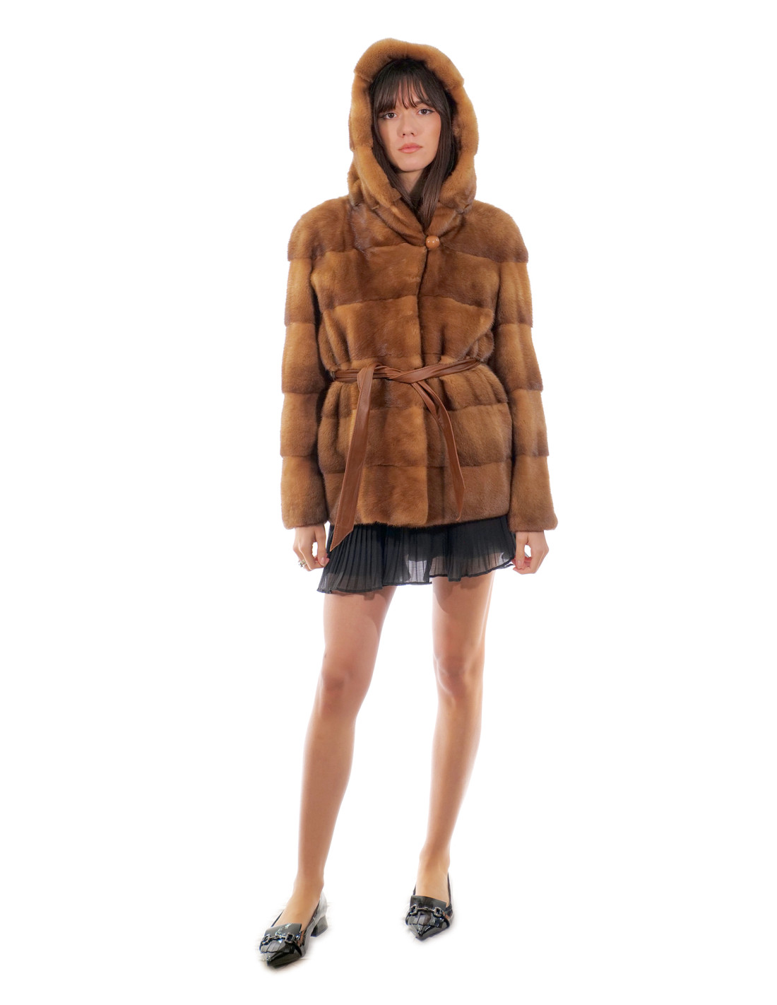Horizontally processed whole skin mink jacket. Our mink furs are products made in our laboratories, therefore a unique and exclusive mink jacket. The possibility of producing our furs of the highest quality allows us to make proposals at different prices with various occasions at low prices always available. Furthermore, our laboratories and our collaborations guarantee a mink fur of undisputed quality 100% made in Italy. The quality of female mink fur used for this is a mink fur jacket with skins signed Saga Furs. The horizontally processed mink fur jacket, 70 centimeters long, comes with external pockets, hook closure and hood with mink fur also internally with button at the neck, long sleeve, external leather belt, all in golden gold color.