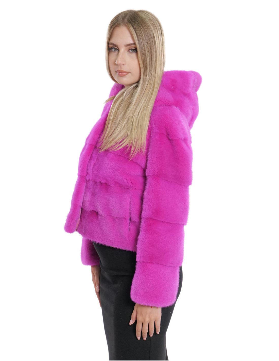 Horizontal full-skin mink jacket. Our mink furs are productions made in our laboratories, therefore a unique and exclusive mink jacket. The possibility of producing our furs of the highest quality allows us to make proposals at different prices with various opportunities at low prices always available. Furthermore, our laboratories and our collaborations guarantee a mink fur of undisputed quality, 100% made in Italy. The quality of female mink fur used for this is a mink fur jacket with skins signed InModa Pellicceria. The 52 centimeter long horizontal mink fur jacket features external pockets, hook closure and hood with mink fur also internally, three-quarter sleeves, all in fuchsia colour.
