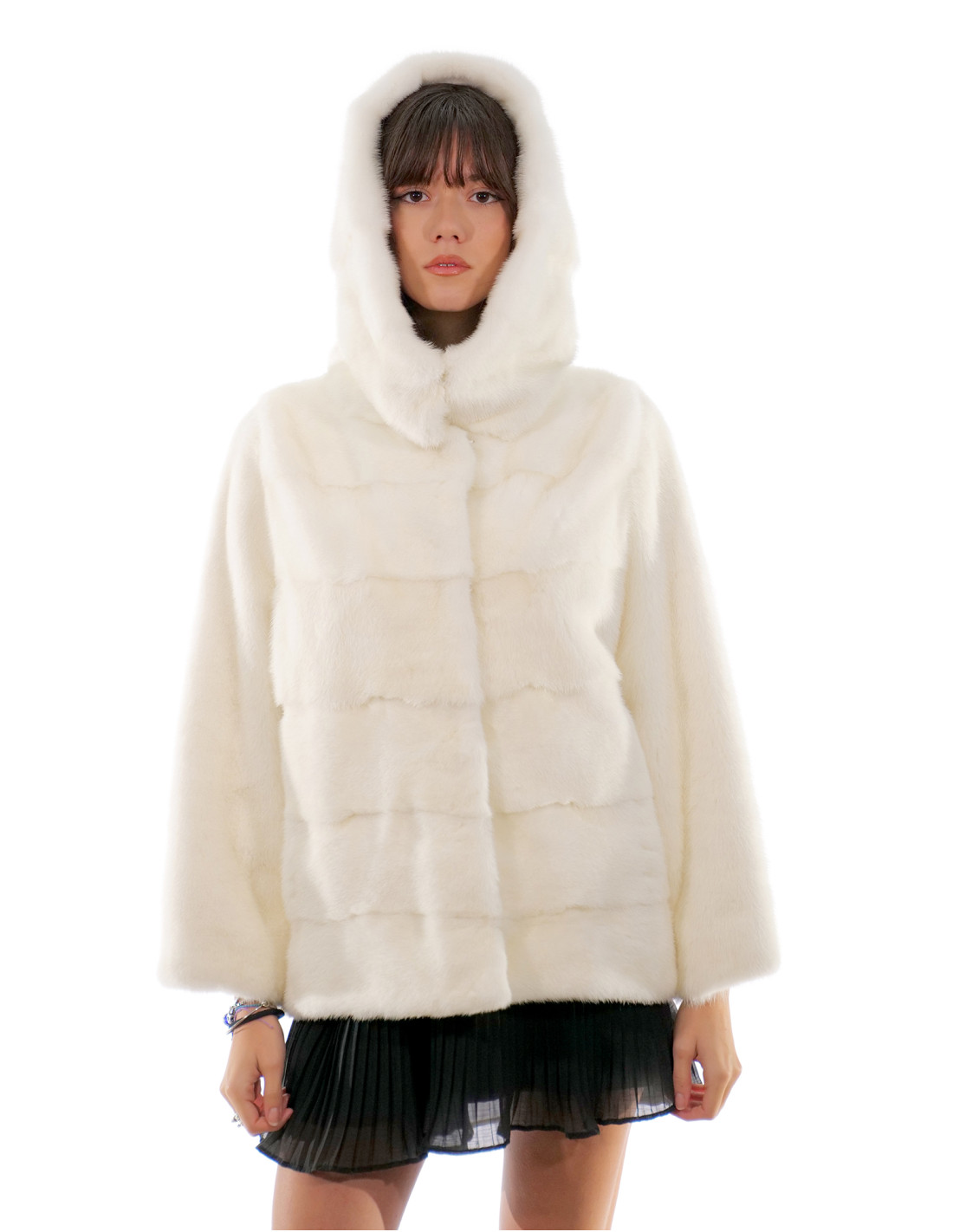 Full-skin mink jacket in horizontal workmanship with full-skin sleeves. Our mink furs are products made in our laboratories, therefore a unique and exclusive mink jacket. The possibility of producing our furs of the highest quality allows us to make proposals at different prices with various occasions at low prices always available. Furthermore, our laboratories and our collaborations guarantee a mink fur of undisputed quality 100% made in Italy. The quality of female mink fur used for this is a mink fur jacket with skins signed Saga Furs. The mink fur jacket in horizontal workmanship with full-skin sleeves, 58 centimeters long, comes with external pockets, hook closure and hood with mink fur also internally, three-quarter bell sleeve, all in optical white color.