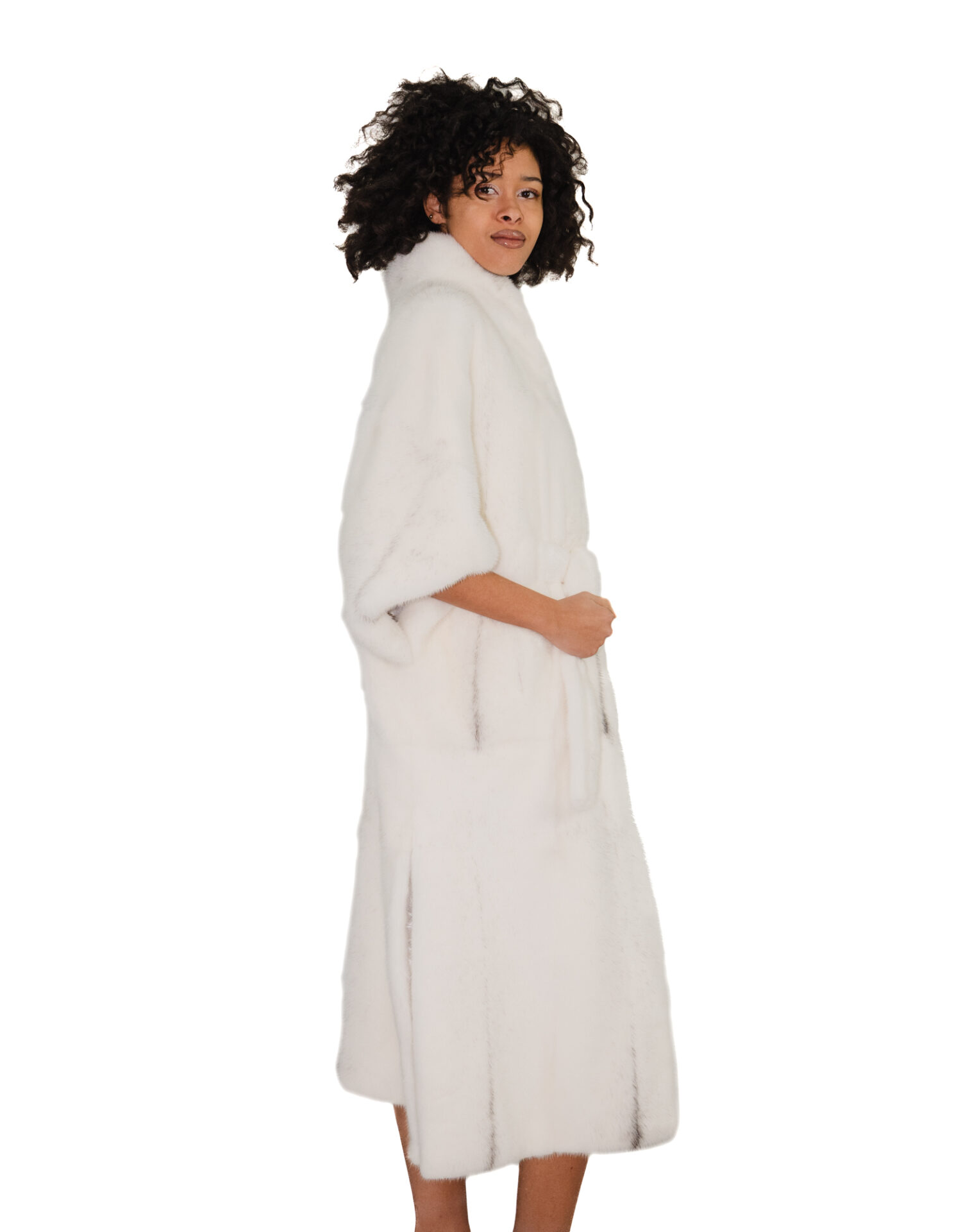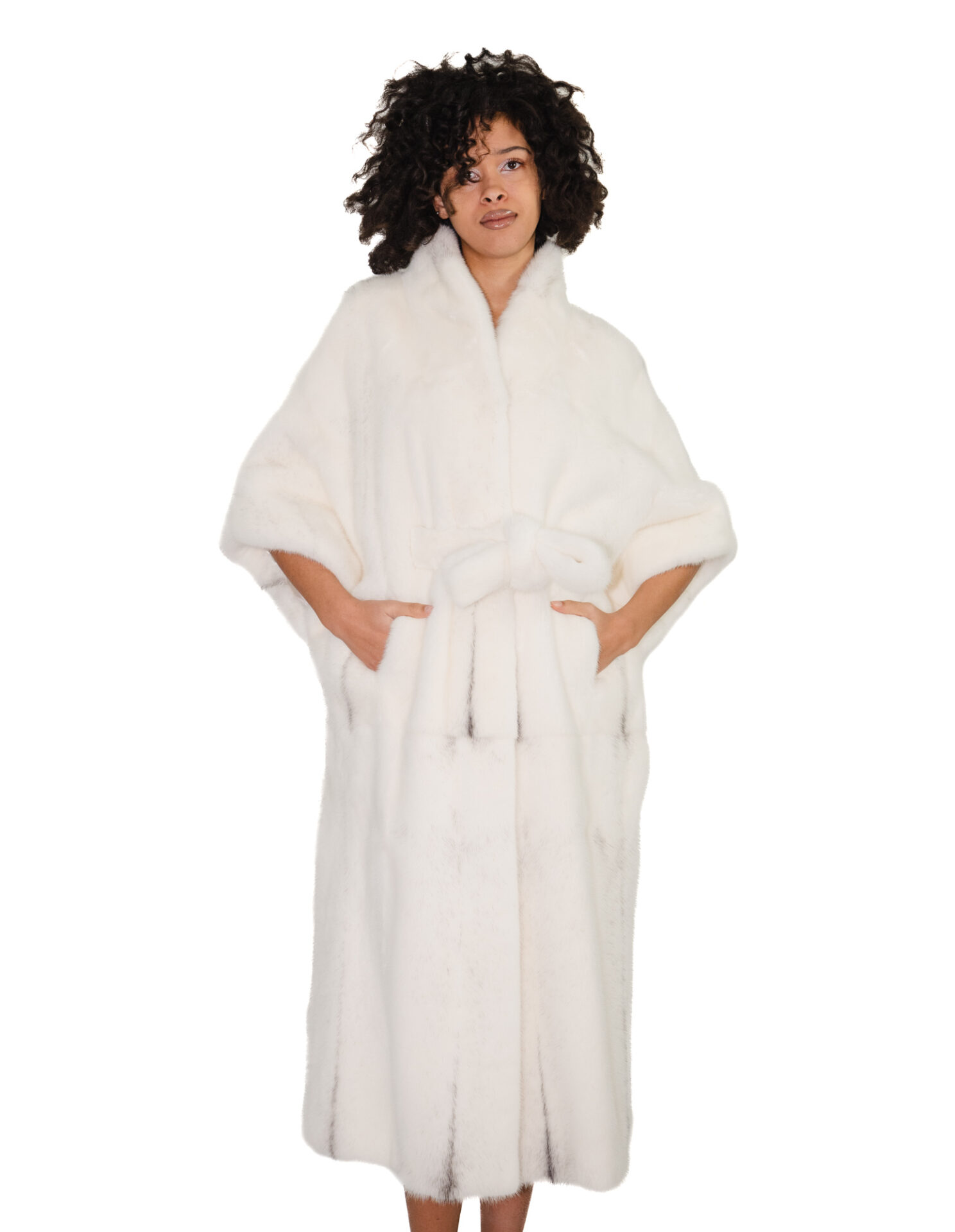 Long mink fur cape with whole skins. Our mink furs are made productions of our workshops, thus a unique and exclusive mink jacket. The ability to produce our furs of the highest quality allows us to make proposals at different prices with a variety of bargains at low prices always available. In addition, our laboratories and collaborations guarantee mink fur of undisputed quality 100% made in italy. The quality of female mink fur used for this is a mink fur jacket with skins initialed Saga Furs. The 124cm long whole-skin mink fur cape, with batwing sleeves, internal hook fastening and piping collar, optical white colour with small grey shades, with a fur belt at the internal waist, external pockets.