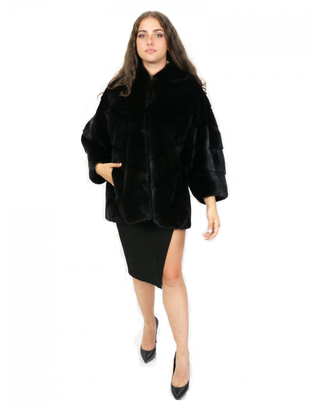 Mink cape jacket with whole skins in transversal processing. Our mink furs are productions made in our workshops, therefore a unique and exclusive mink jacket. The possibility of producing our furs of the highest quality allows us to make proposals at different prices with various occasions at low prices always available. Furthermore, our laboratories and our collaborations guarantee a mink fur of undisputed quality 100% made in Italy. The quality of female mink fur used for this is a mink fur jacket with InModa Pellicceria branded skins. The mink fur jacket comes in transversal processing with external pockets, hook closure and hood lined in mink fur, in black and long sleeves.