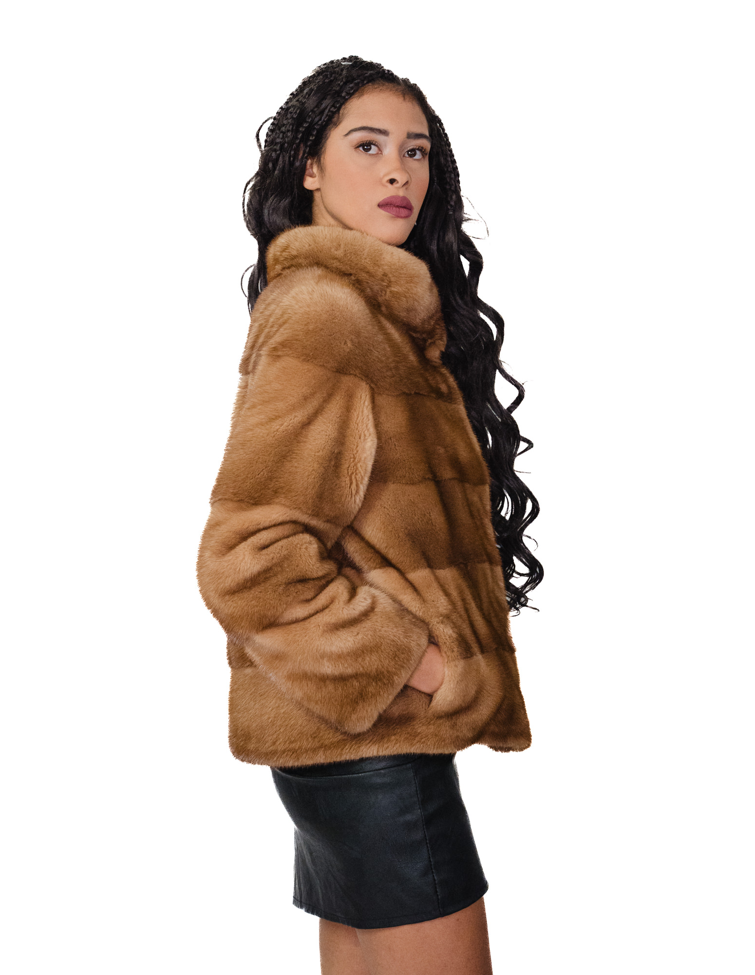 Whole-skin mink fur jacket horizontal processing. Our mink furs are made productions of our workshops, thus a unique and exclusive mink jacket. The ability to produce our furs of the highest quality allows us to make proposals at different prices with a variety of bargains at low prices always available. In addition, our laboratories and collaborations guarantee mink fur of undisputed quality 100% made in italy. The quality of female mink fur used for this is a mink fur jacket with skins initialed Saga Furs. The mink fur jacket in full-skin horizontal workmanship is 62 centimeters long with outside pockets, hook-and-eye closure and high track collar, long sleeve, inside drawstring waist, all in light blond gold color.
