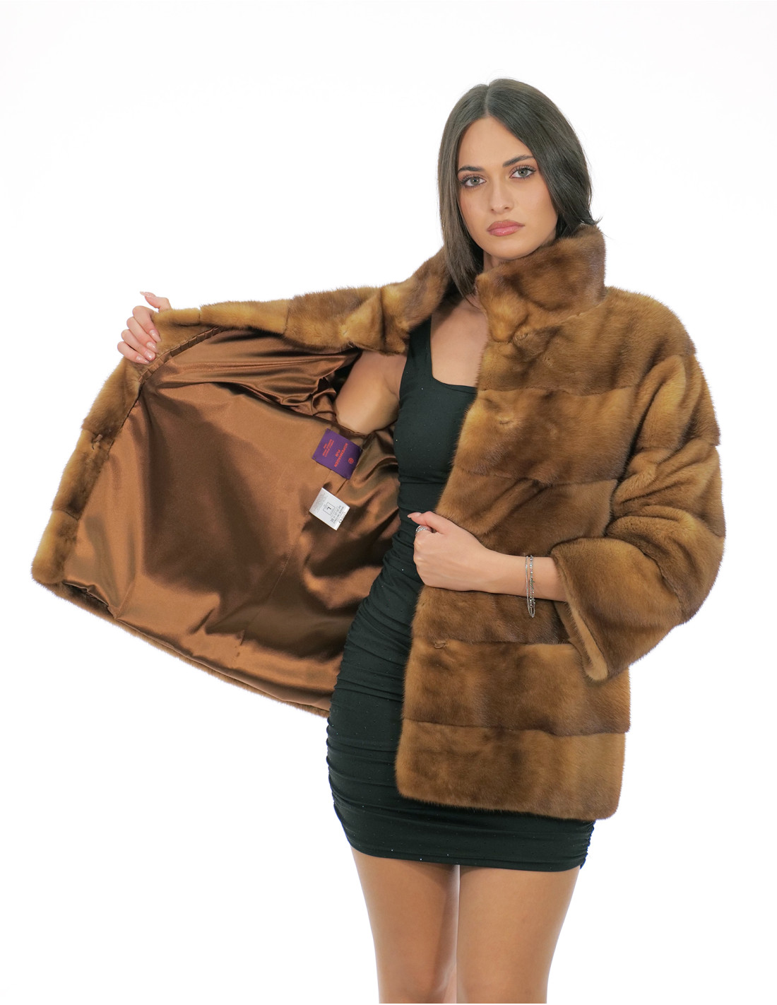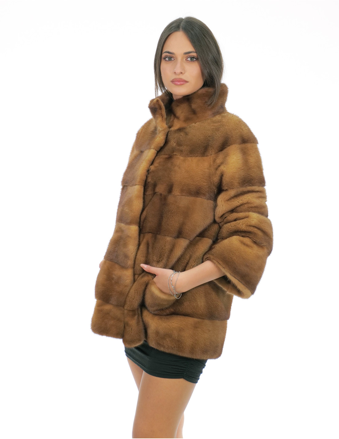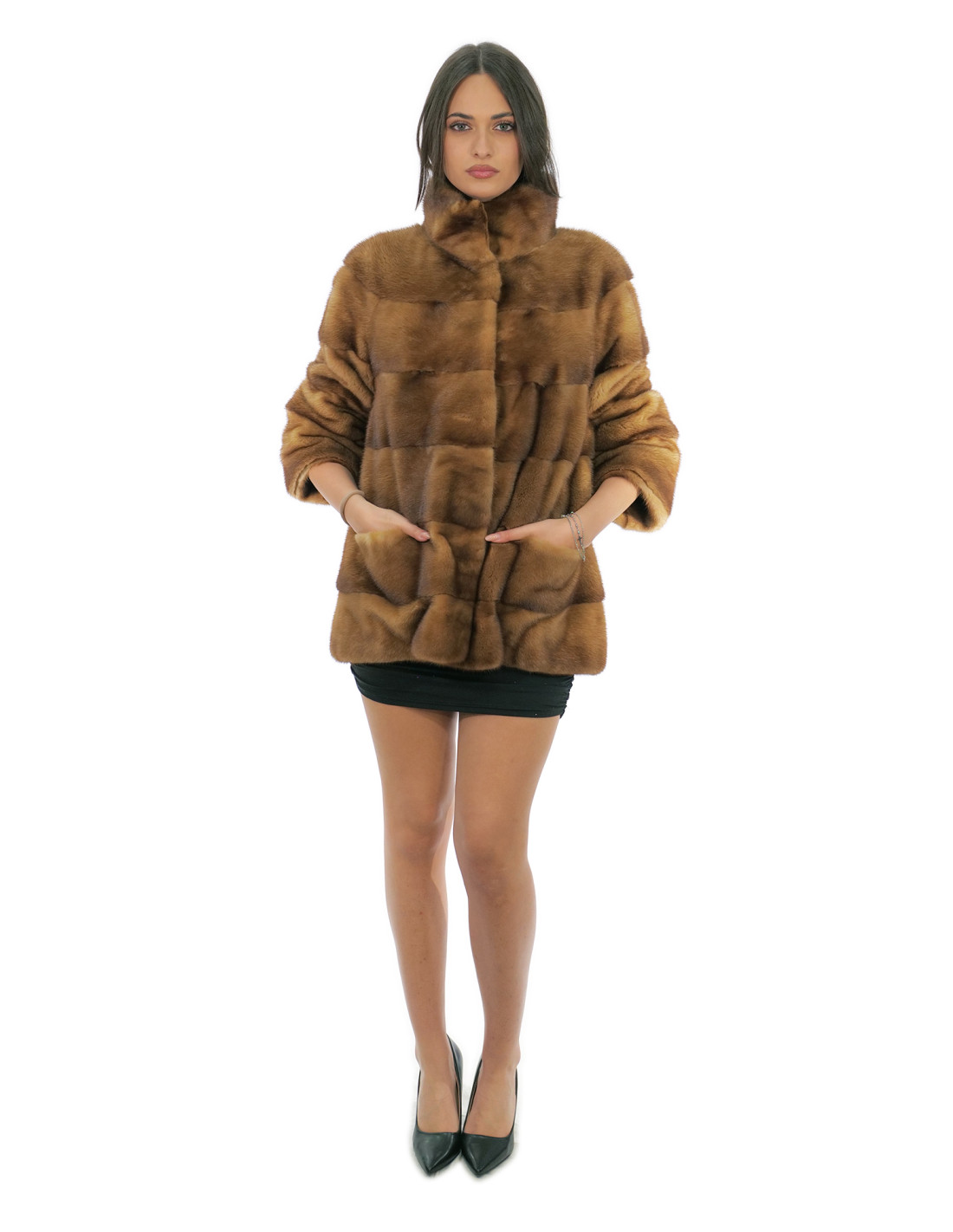 Mink fur coat with whole skins with horizontal processing. Our mink furs are productions made in our laboratories, therefore a unique and exclusive mink jacket. The possibility of producing our furs of the highest quality allows us to make proposals at different prices with various occasions at low prices always available. Furthermore, our laboratories and our collaborations guarantee a mink fur of undisputed quality 100% made in Italy. The quality of female mink fur used for this is a mink fur jacket with skins signed Kopenaghen Furs. The mink fur coat in horizontal processing, 70 centimeters long, has external side pockets, hook closure, piping collar, hidden internal pocket on the right side, all in gold color.