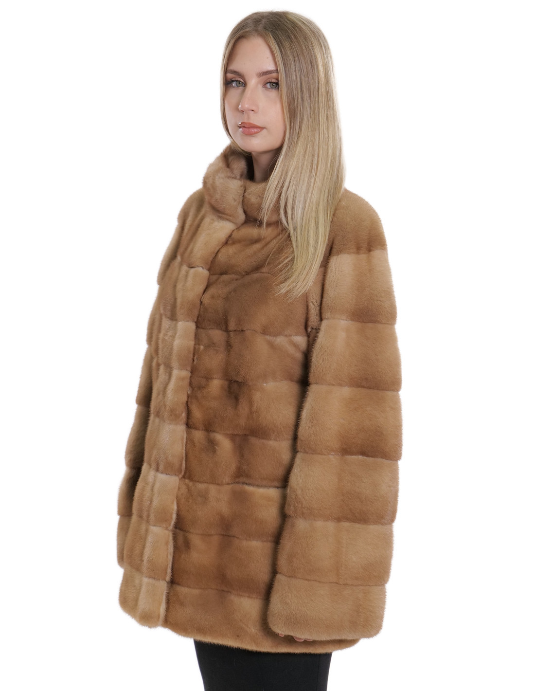 Mink fur coat with whole skins with horizontal processing. Our mink furs are productions made in our laboratories, therefore a unique and exclusive mink jacket. The possibility of producing our furs of the highest quality allows us to make proposals at different prices with various opportunities at low prices always available. Furthermore, our laboratories and our collaborations guarantee a mink fur of undisputed quality, 100% made in Italy. The quality of female mink fur used for this is a mink fur jacket with skins signed Copenhagen furs. The mink fur coat in horizontal workmanship, 72 centimeters long, long sleeves, hook closure, mug pockets, with mandarin collar, all in redglow beige colour.
