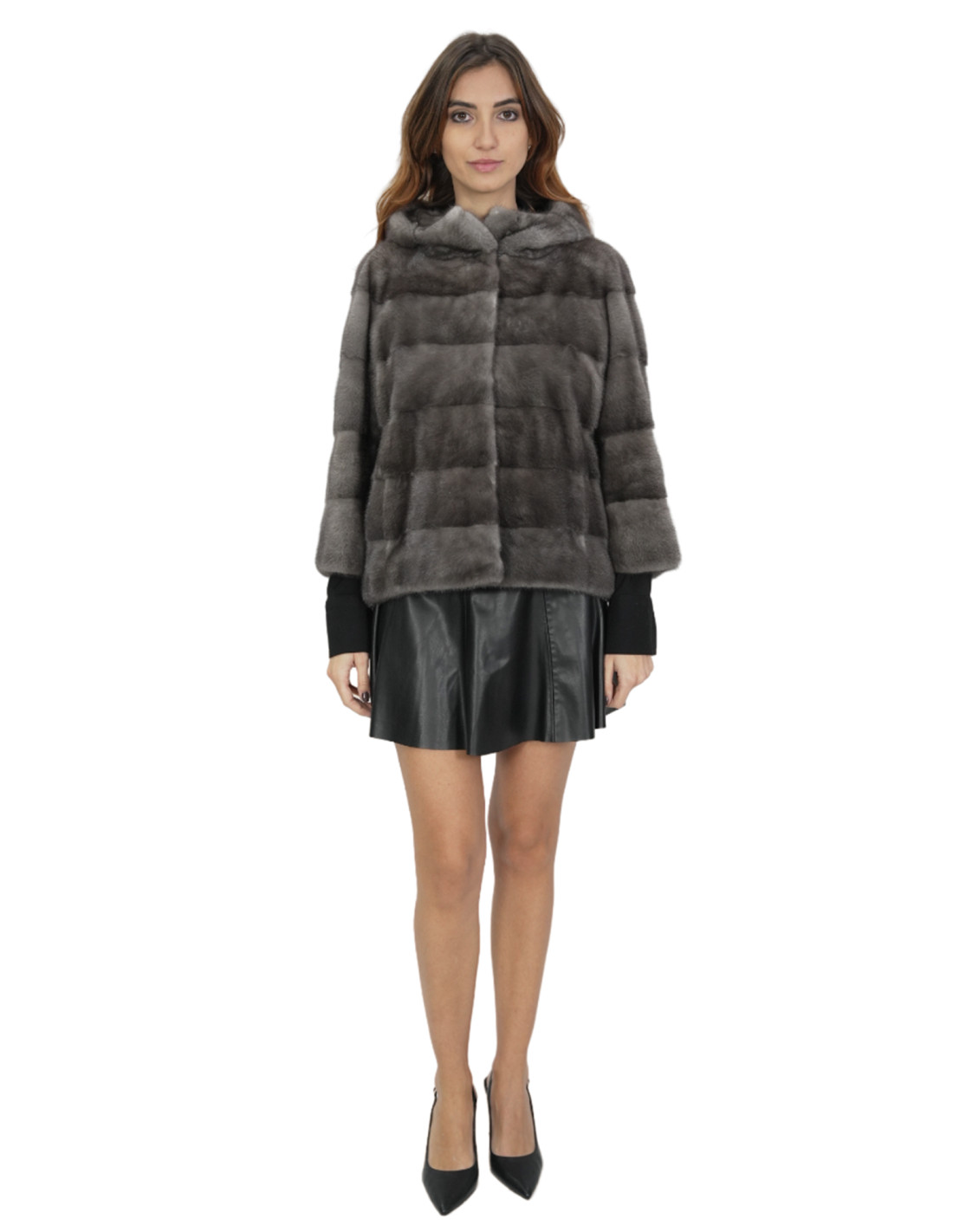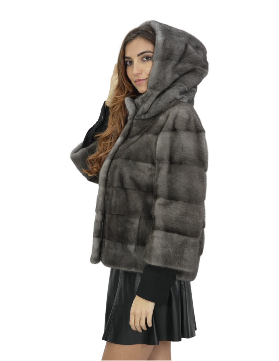 Horizontal full-skin mink jacket. Our mink furs are productions made in our laboratories, therefore a unique and exclusive mink jacket. The possibility of producing our furs of the highest quality allows us to make proposals at different prices with various opportunities at low prices always available. Furthermore, our laboratories and our collaborations guarantee a mink fur of undisputed quality, 100% made in Italy. The quality of female mink fur used for this is a mink fur jacket with skins signed Copenhagen furs. The 58 centimeter long horizontal mink fur jacket features external pockets, hook closure and hood with mink fur also internally, three-quarter sleeves, all in iris blue colour.
