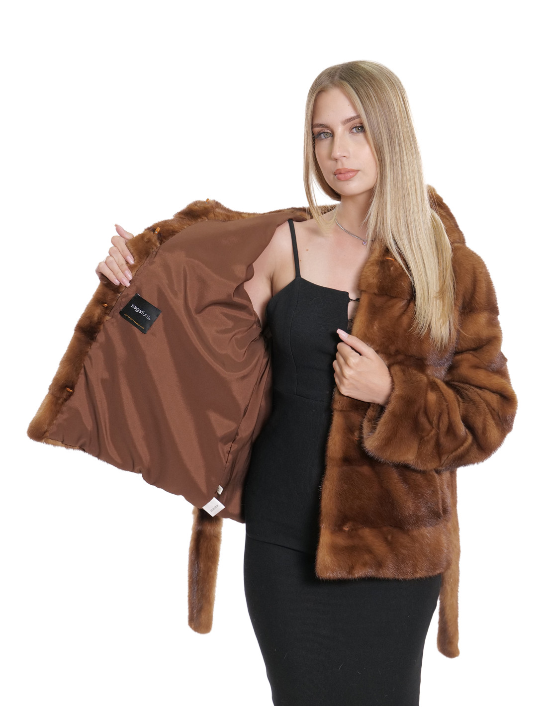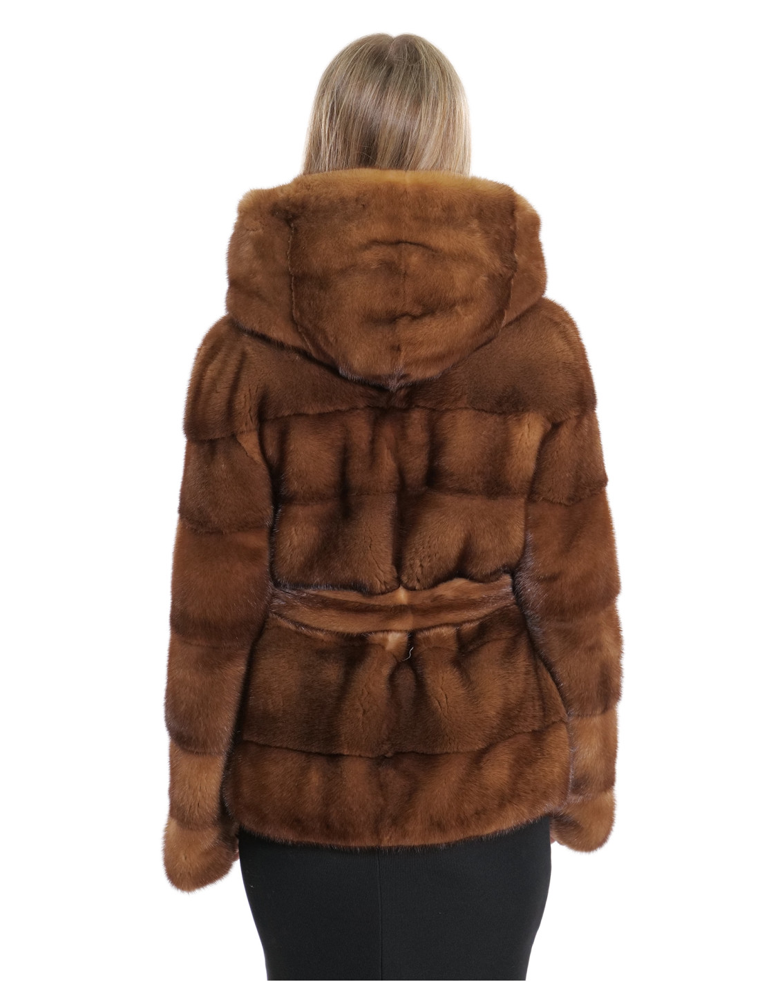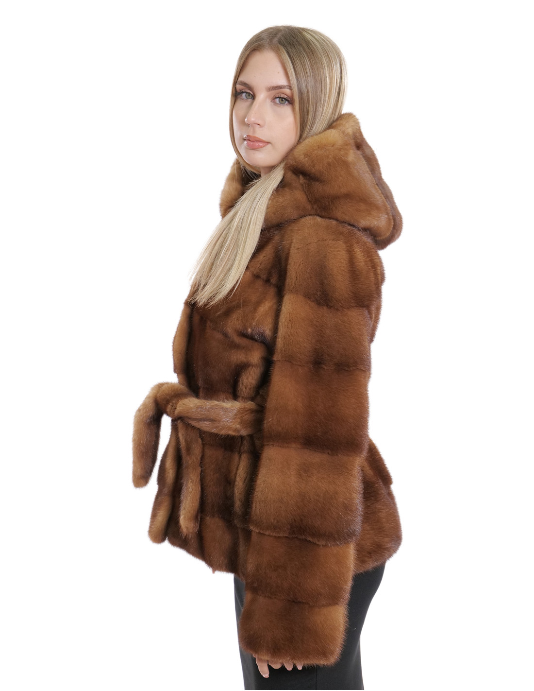 Horizontal full-skin mink jacket. Our mink furs are productions made in our laboratories, therefore a unique and exclusive mink jacket. The possibility of producing our furs of the highest quality allows us to make proposals at different prices with various opportunities at low prices always available. Furthermore, our laboratories and our collaborations guarantee a mink fur of undisputed quality, 100% made in Italy. The quality of female mink fur used for this is a mink fur jacket with Saga Furs branded pelts. The 56 centimeter long horizontal mink fur jacket features external pockets, hook closure and hood with mink fur also internally, long sleeves, external fur belt, all in gold colour.