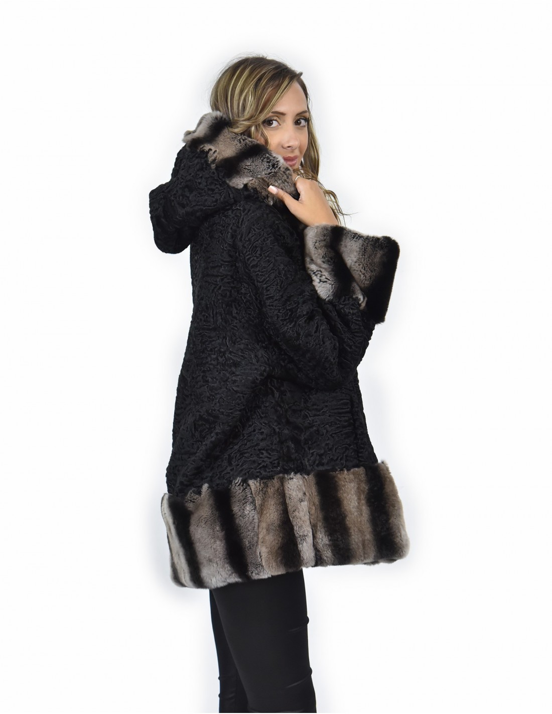 Persian swakara and rex fur jacket. Our Persian furs are productions made in our workshops, therefore a unique and exclusive Persian jacket. The possibility of producing our furs of the highest quality allows us to make proposals at different prices with various occasions at low prices that are always available. Furthermore, our laboratories and our collaborations guarantee a Persian fur of undisputed quality 100% made in Italy. The quality of Persian fur used for this is a Persian fur jacket with leathers signed InModa Pellicceria. The Persian fur jacket comes in black and gray with a hood edged with rex fur at the edges and at the cuffs, hook closure, slits on the bottom of the side and external pockets.
