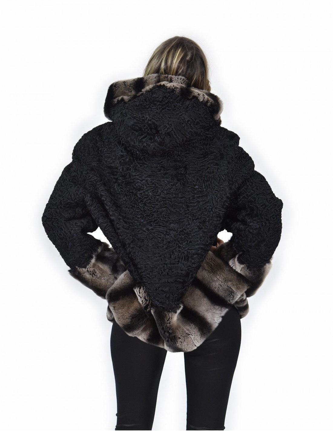 56 jacket in black and gray Persian fur with rex fur hood edged