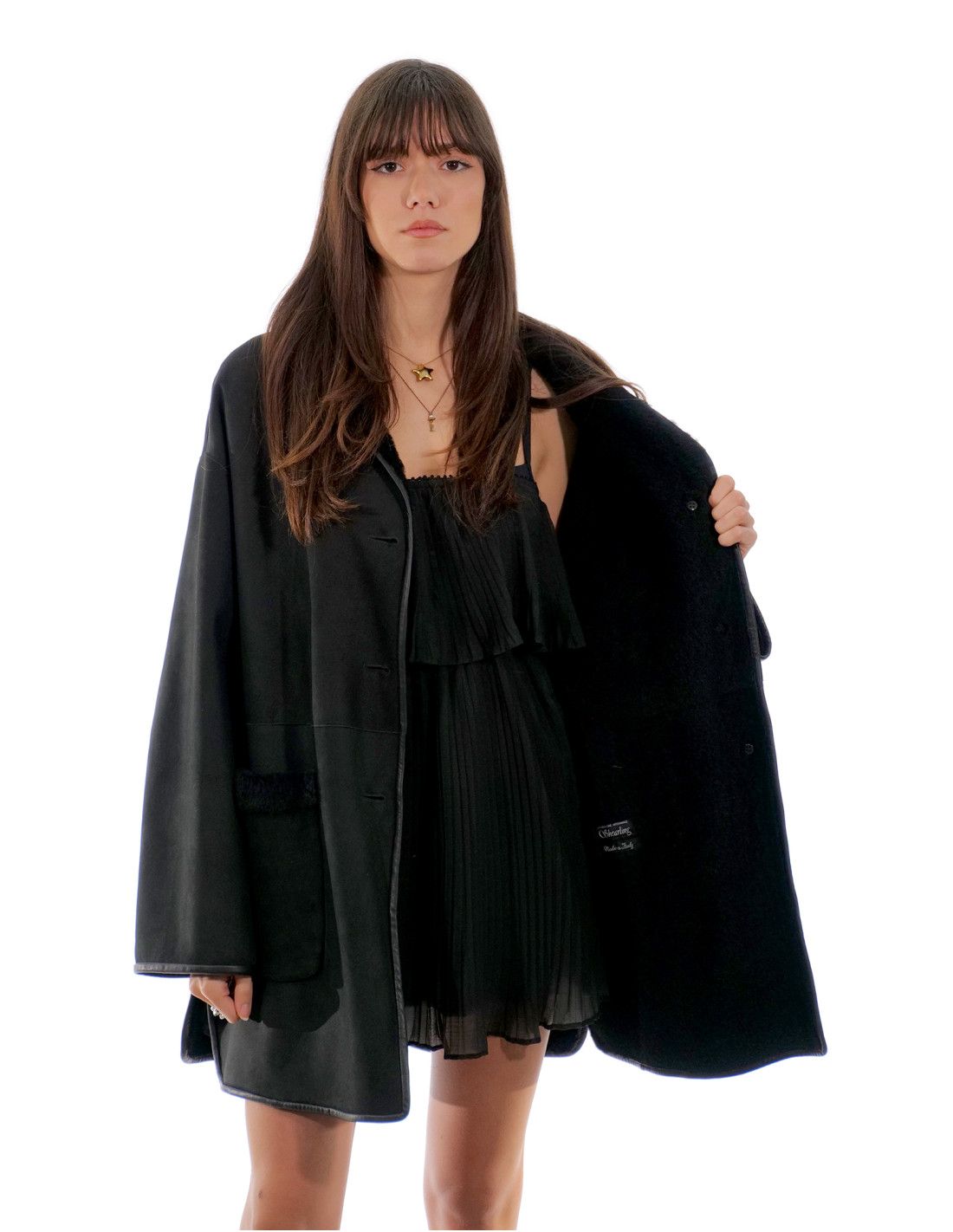 Sheepskin coat inside and outside in suede. Our sheepskin furs are productions made in our laboratories, therefore a unique and exclusive sheepskin jacket. The possibility of producing our furs of the highest quality allows us to make proposals at different prices with various occasions at low prices always available. Furthermore, our laboratories and our collaborations guarantee a mink fur of undisputed quality 100% made in Italy. The quality of sheepskin fur used for this is a mink fur jacket with skins signed InModa Pellicceria. The sheepskin fur coat in whole skin workmanship 82 centimeters long in suede outside and inside in curly sheepskin fur shaved, long sleeve, button closure, side pockets and shawl collar, all in black.