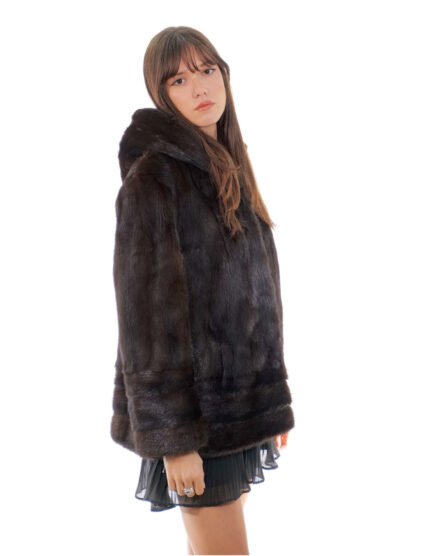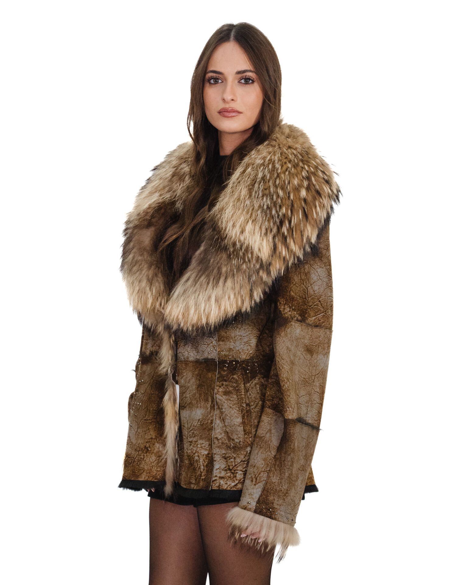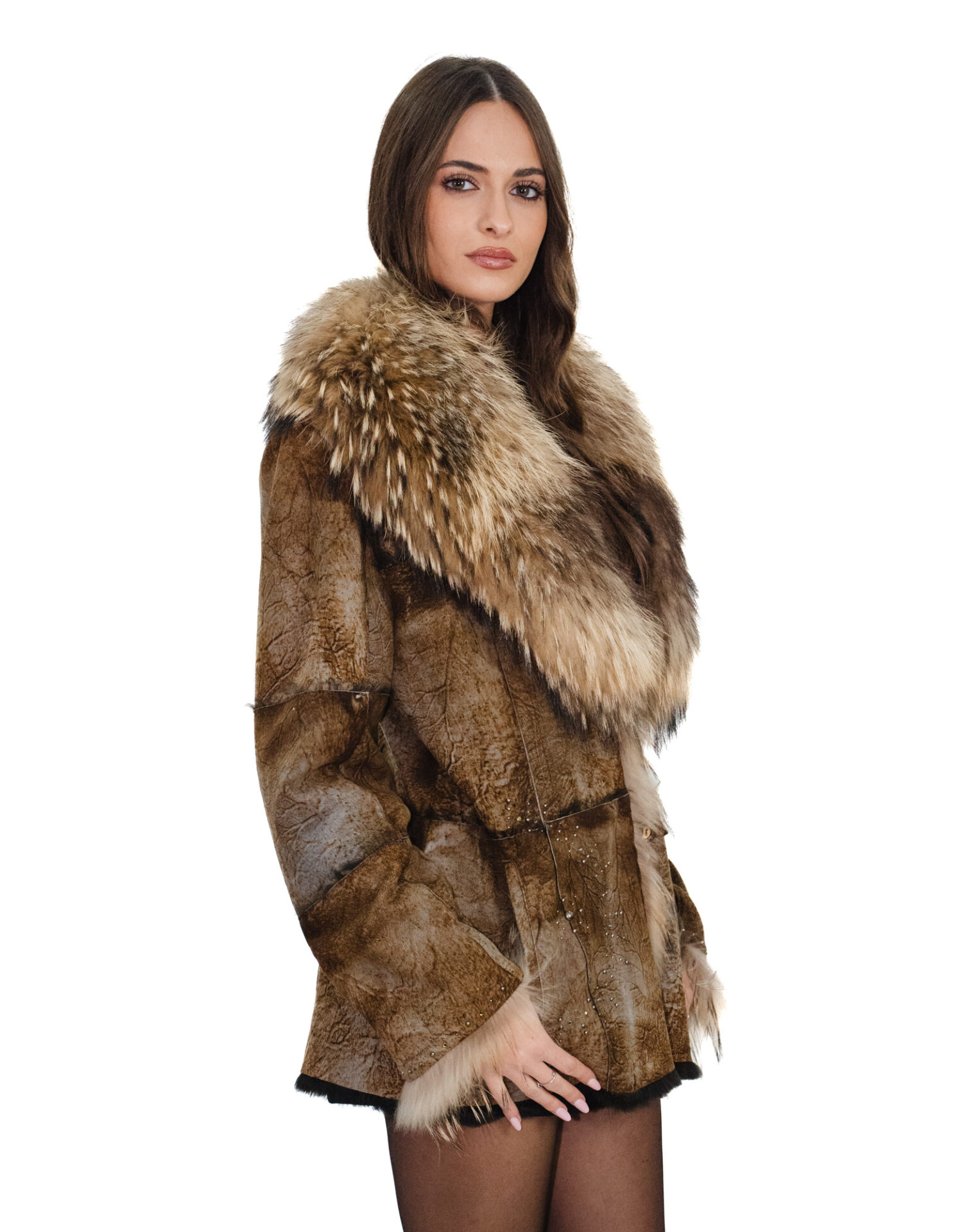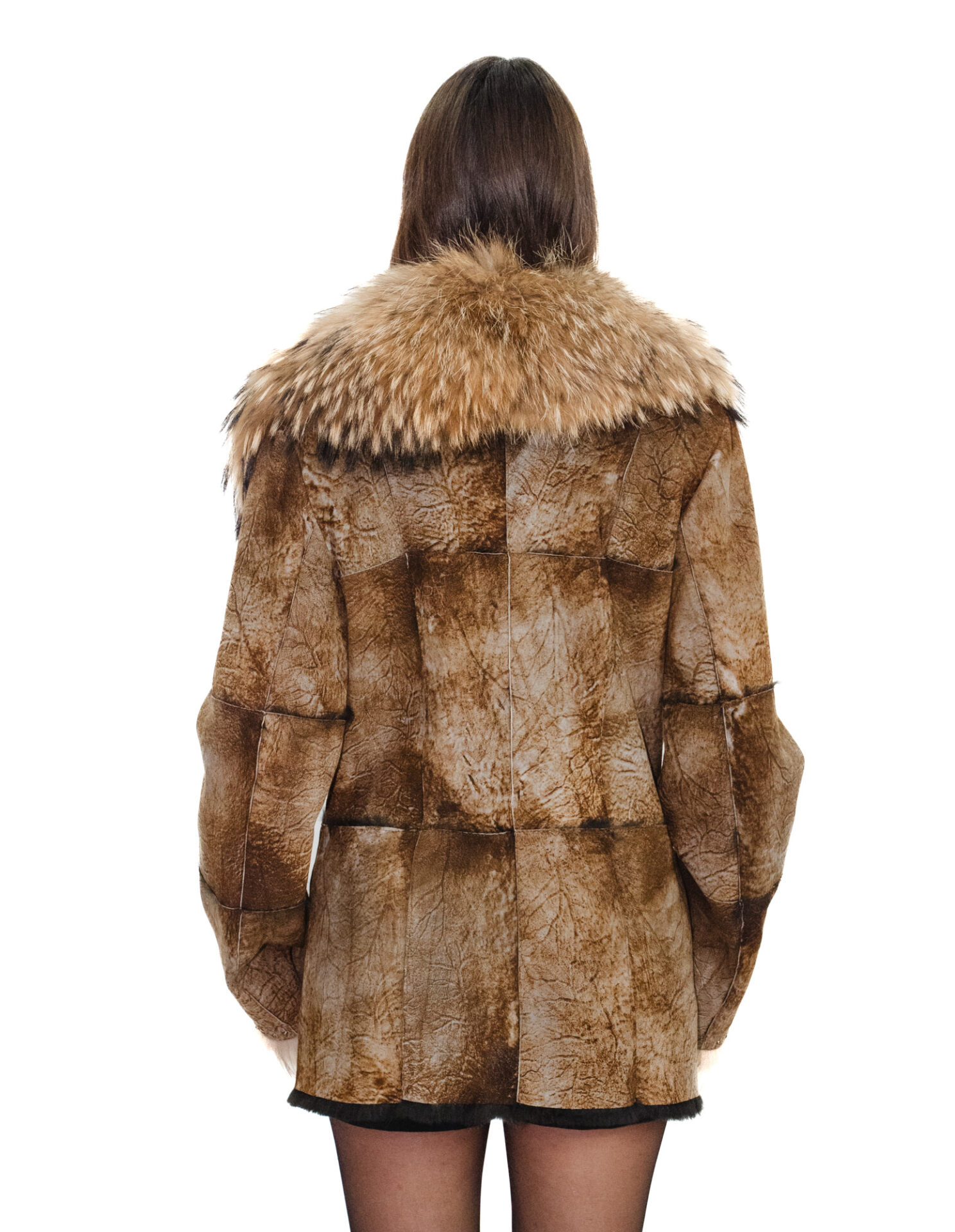 Brown rabbit fur jacket with black fur inside, size 46, large fox collar, shawl collar, long sleeves, button and buttonhole closure