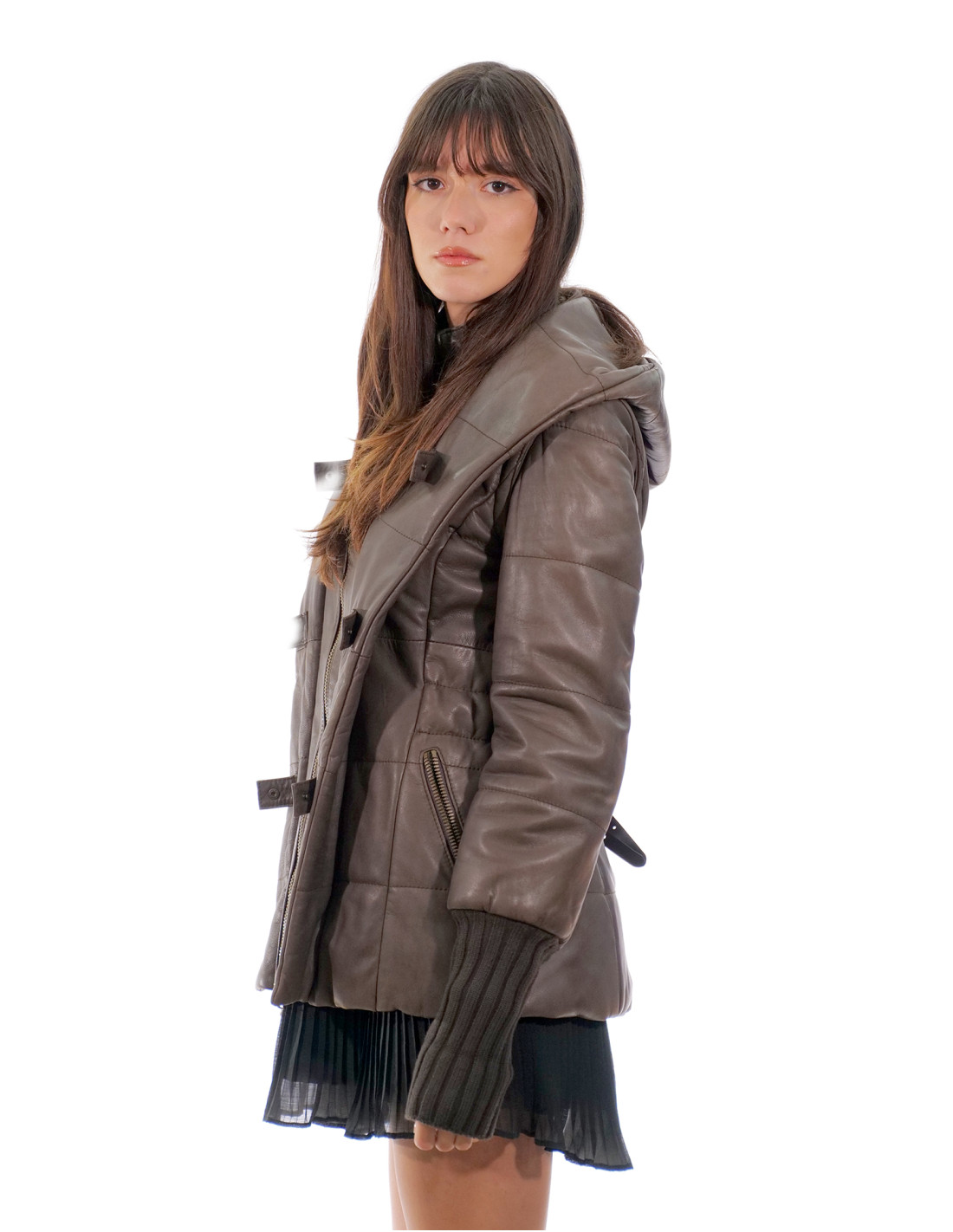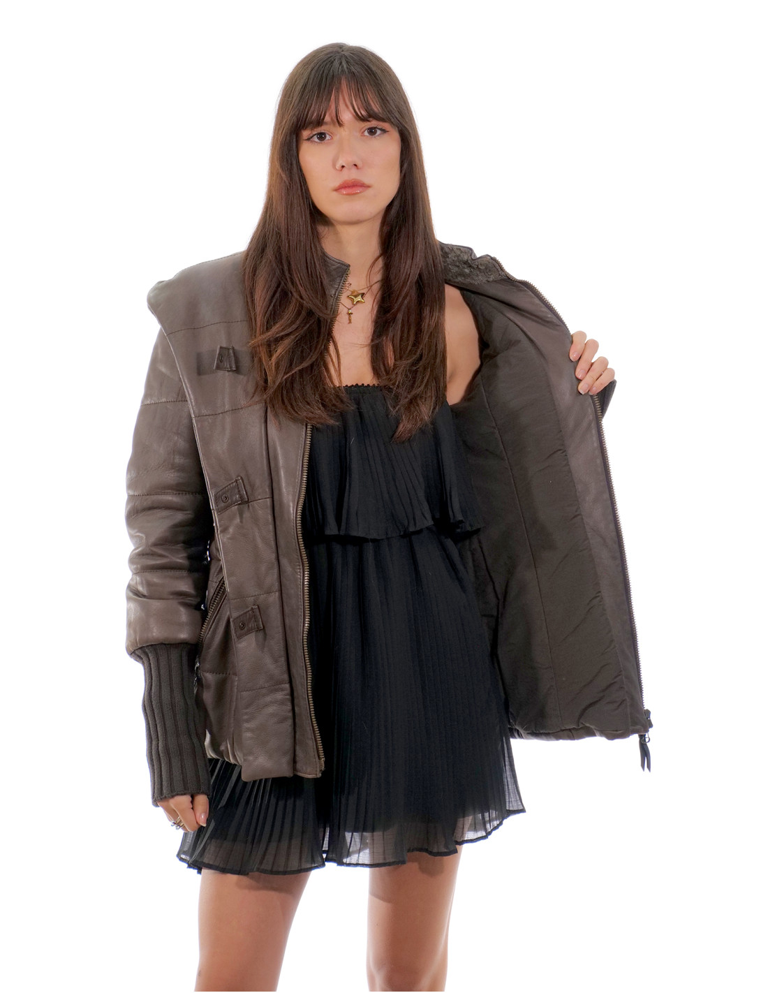 Dark brown, dark brown, real leather jacket with long sleeves and wool cuffs at the ends, zip fastening with double-breasted leather front with button fastening, external pockets with zip fastening, leather collar, martin gala on the back and dark grey lining