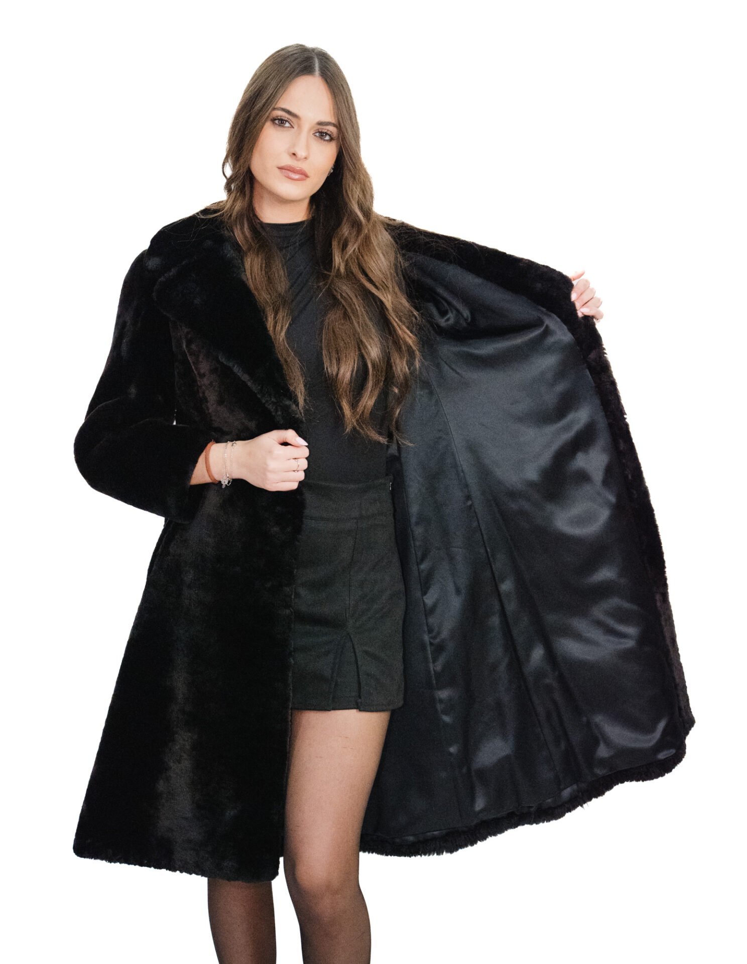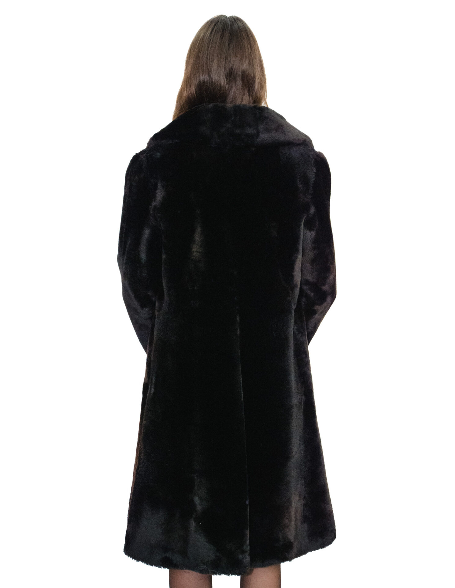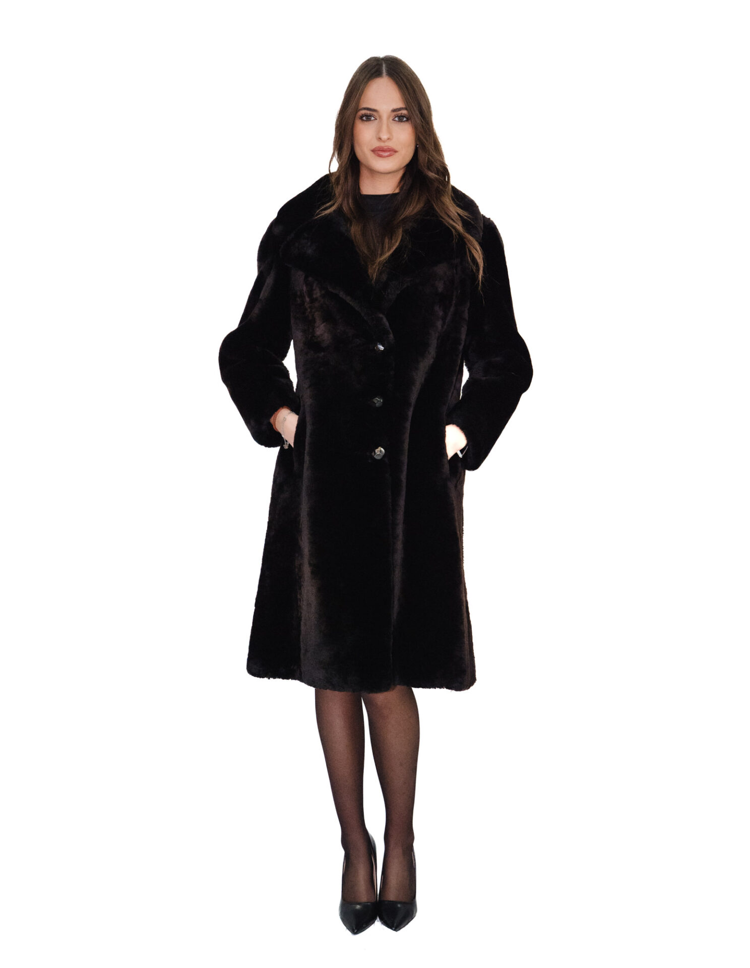 Home » Shop » Black sheepskin coat with fur collar and lapel size 42 long sleeves with buttons and buttonholes