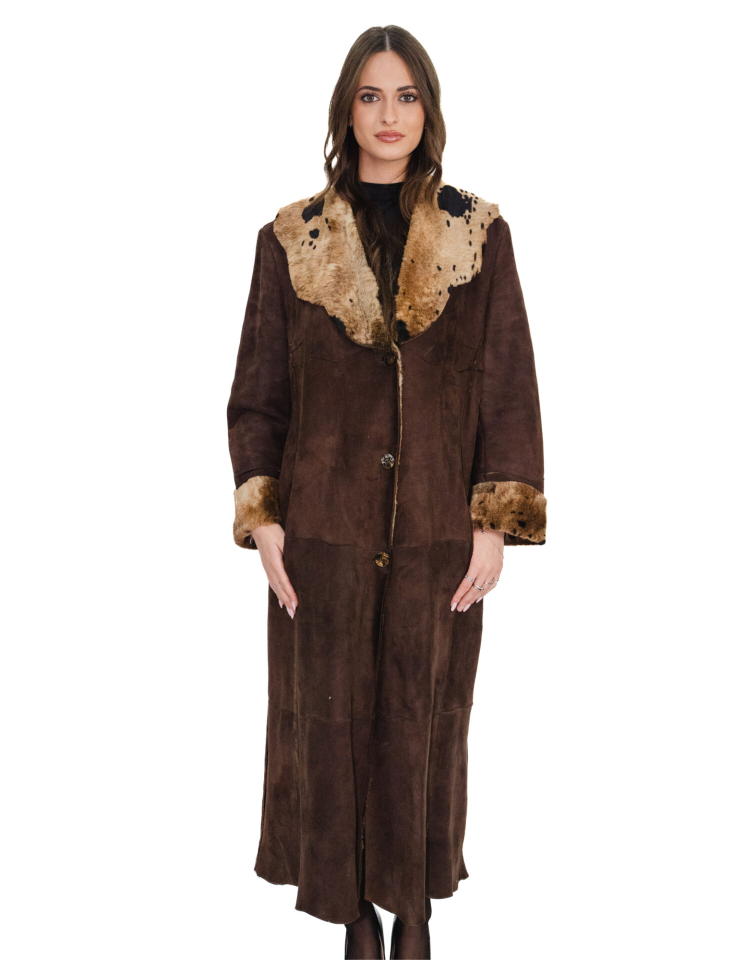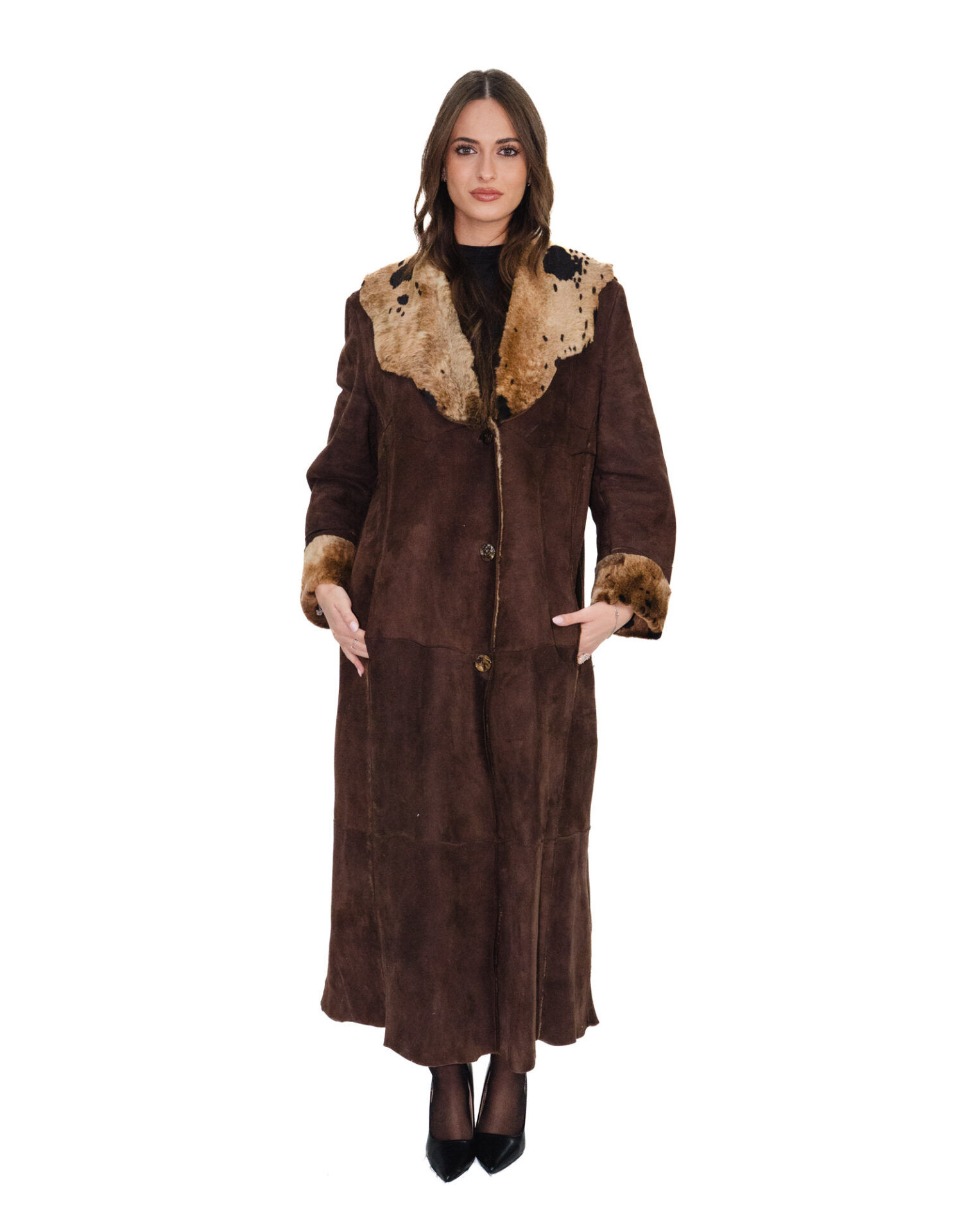 Very long coat 126 cm sheepskin outside brown leather and inside spotted fur 50 raw cut shawl collar and cuffs with turn-ups