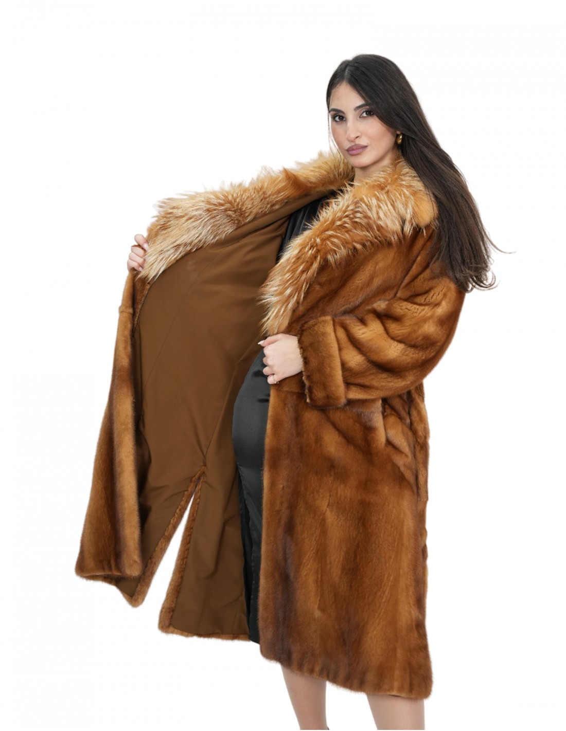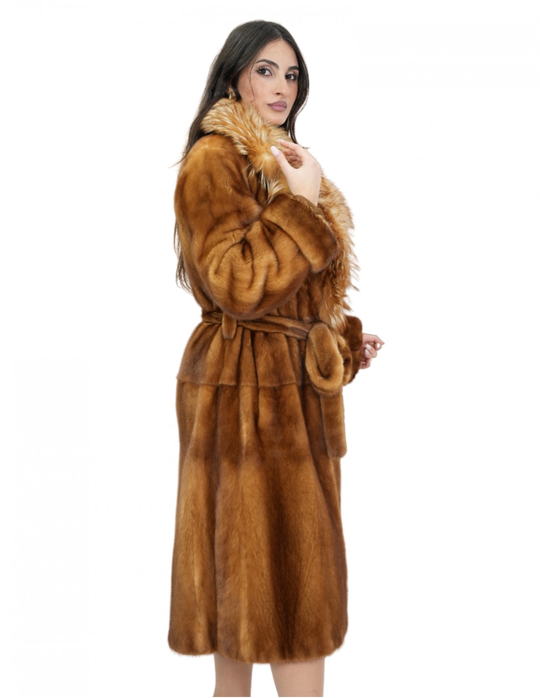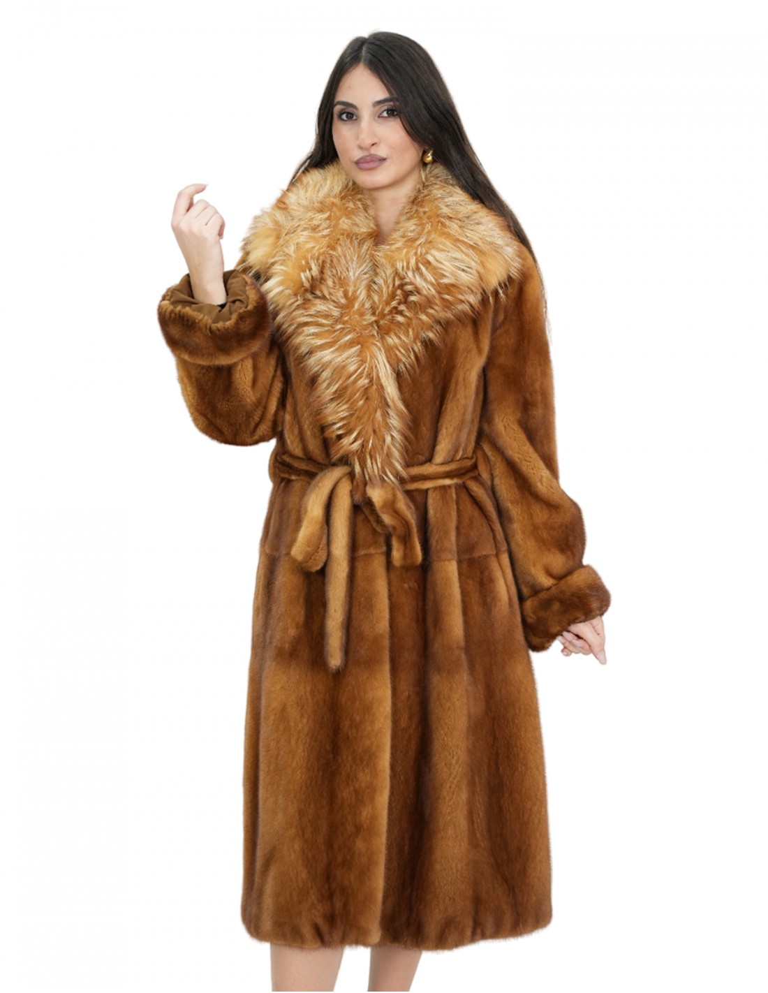 Full skin mink coat with fox collar in gold color with long cuffed sleeves, fur belt, fox fur shawl collar, practical side slits on the bottom, hook closure and external pockets.