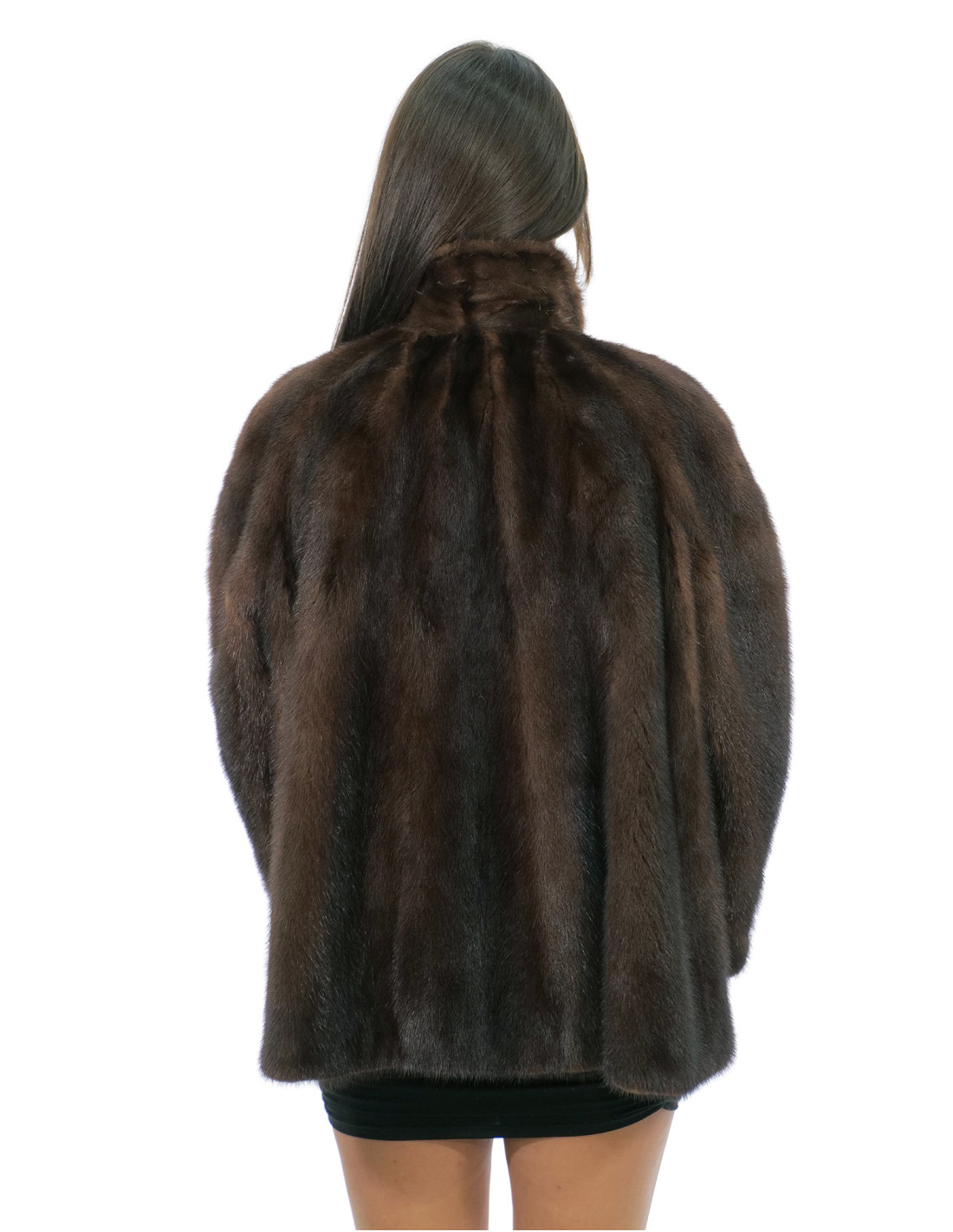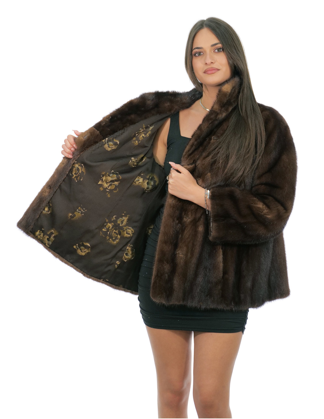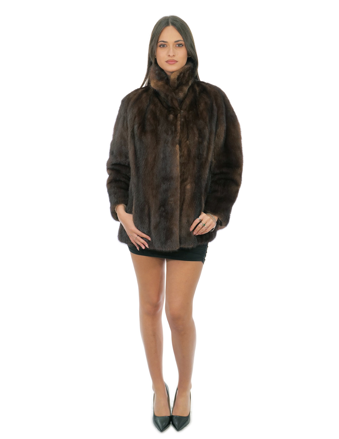 Demi buff full-skin mink fur jacket with piping collar, normal external pockets, long sleeves, hook fastening, the model is bell-shaped and widens towards the bottom.