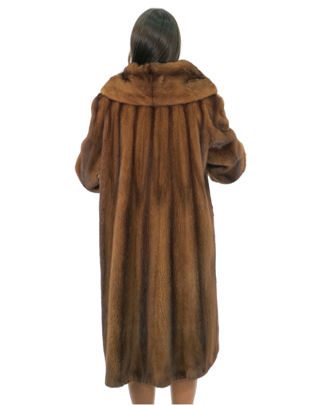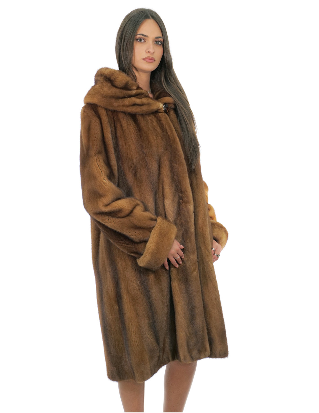 106cm long coat in vertically transported mink fur with large Italian collar, long sleeve with lapel of your choice, decorative button at the collar, external pockets.