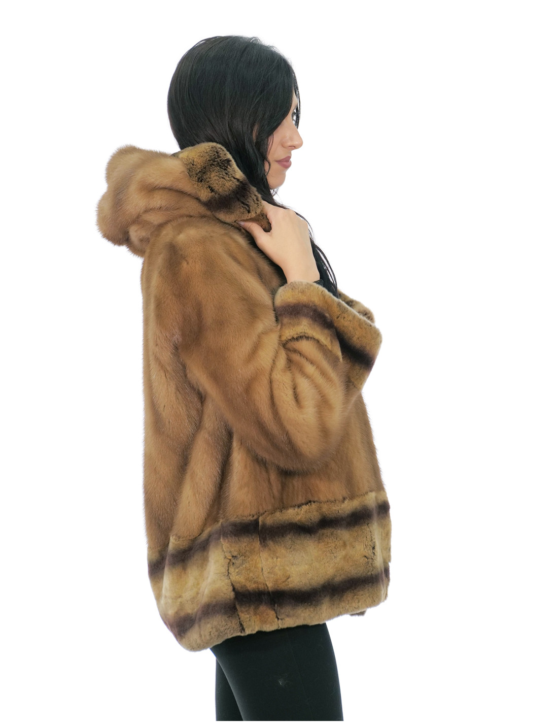Mink fur coat with cuff trim and bottom rex 44 gold fur-lined hood external pockets