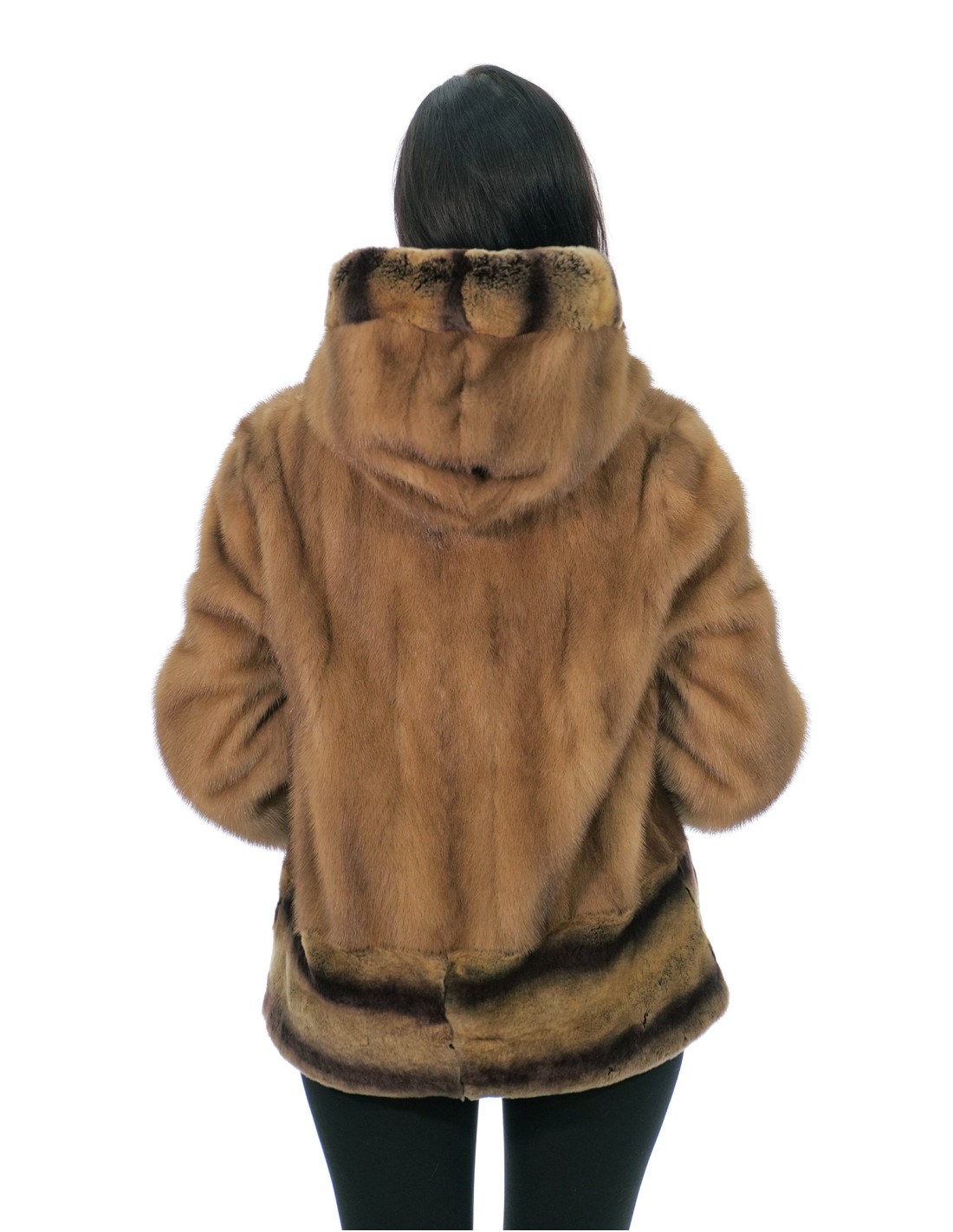 Home » Shop » Mink fur coat with cuff trim and bottom rex 44 gold fur-lined hood external pockets