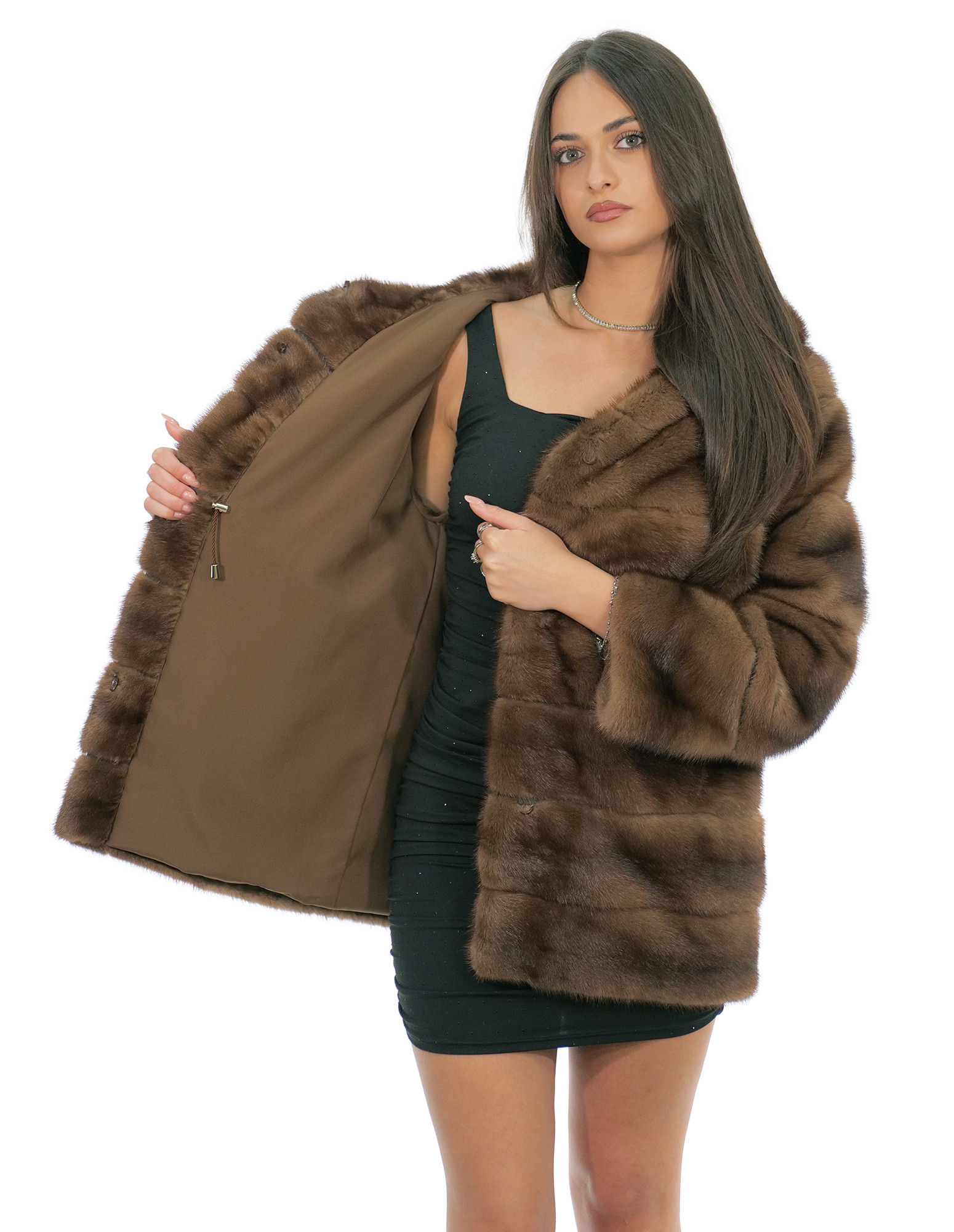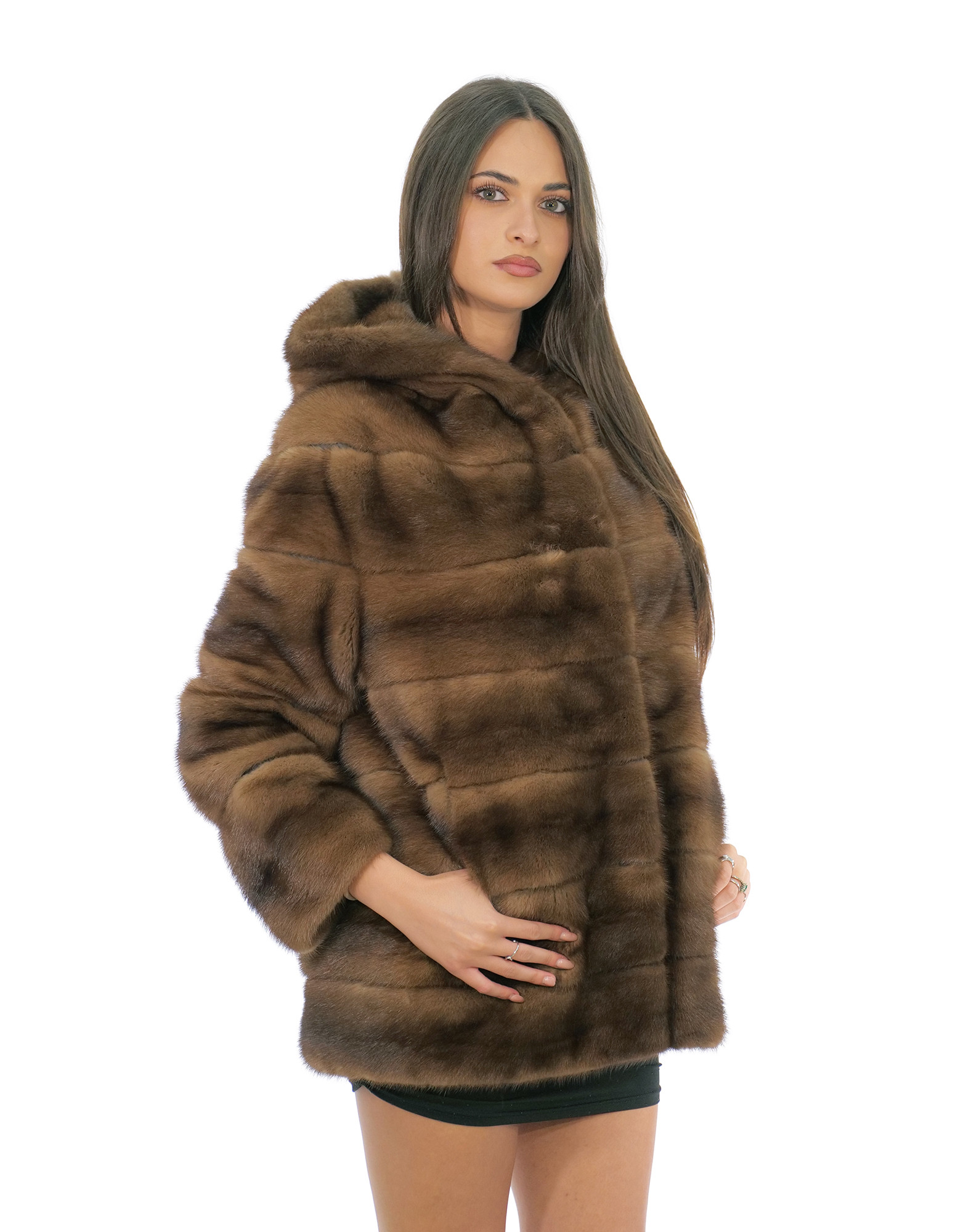Horizontal mink fur coat with 3/4 sleeves, hood lined with mink fur, hook fastening, internal drawstring waist, external pockets and brown lining.