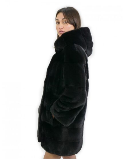 Jacket size 44 long 88 cm fur mink horizontal hood black sleeve 3/4