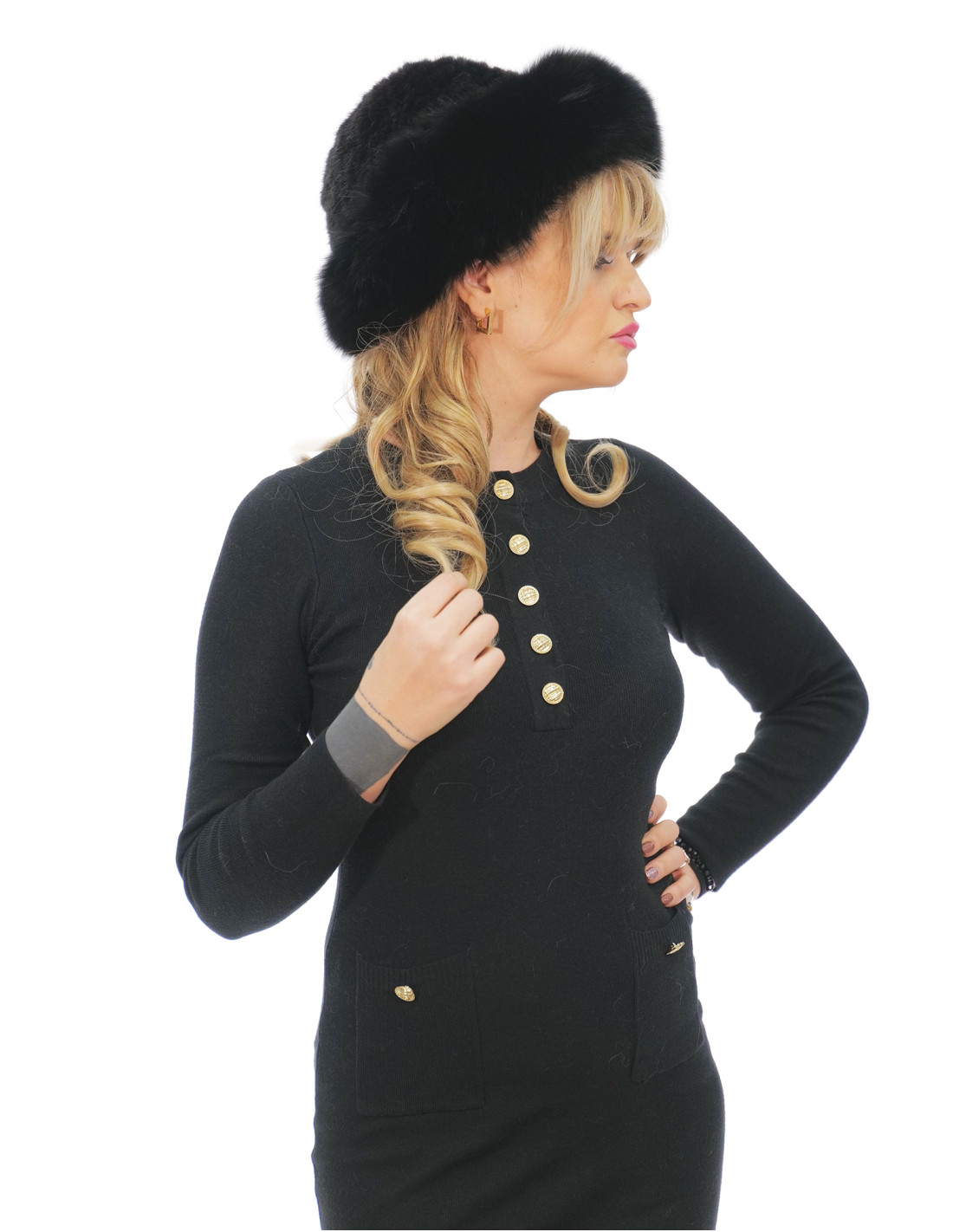 Cappello in pelliccia di visone tricot e volpe al bordo colore nero con coulisse sotto e lana