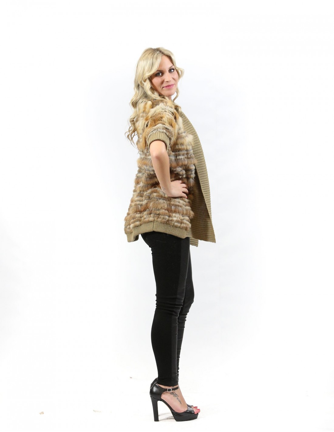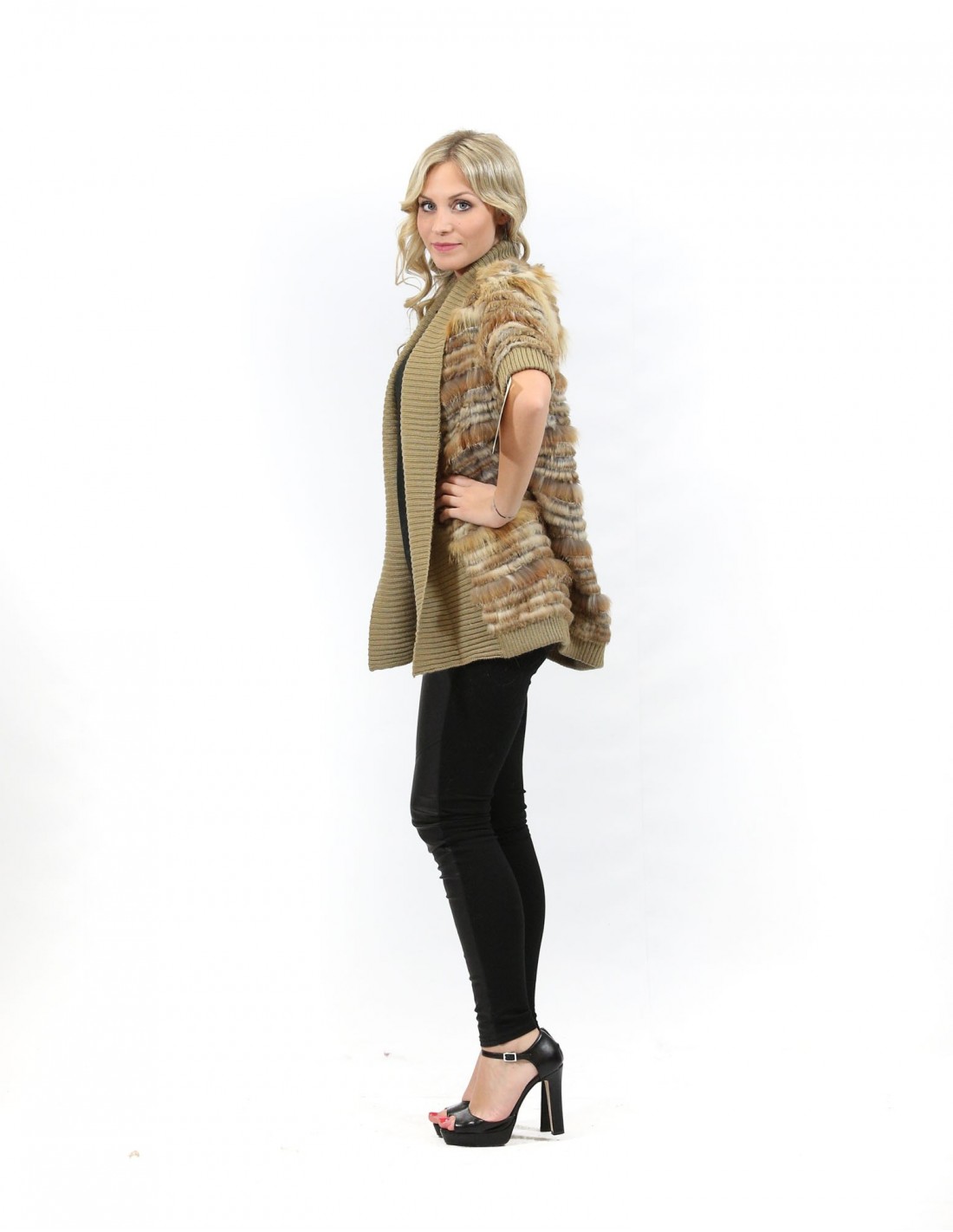 Pelliccia giacca tipo cardigan donna marrone di lapin e volpe con tessuto