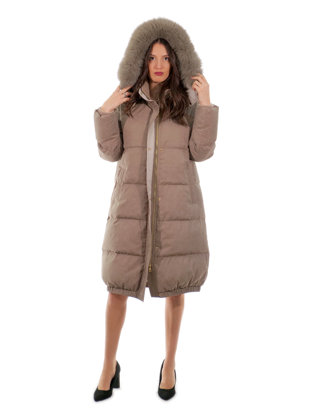 Cappotto tessuto tecnico piumino 106 centimetri grigio 50 con cappuccio staccabile pelliccia volpe bordo