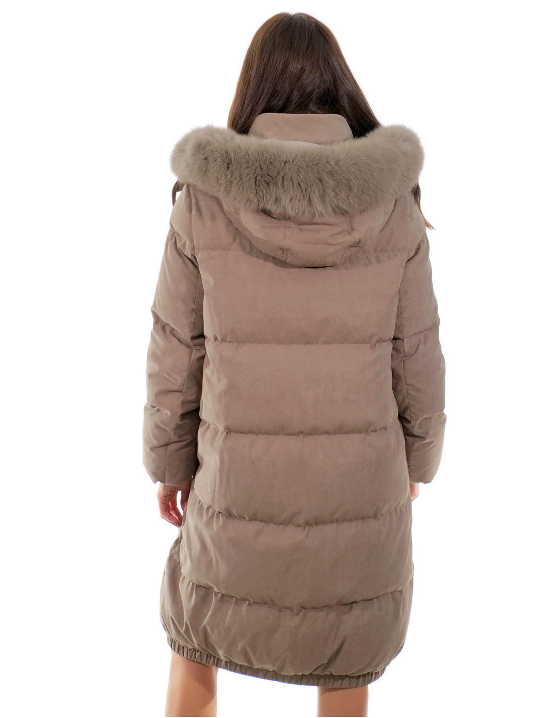 Cappotto lungo 106 centimetri in tessuto tecnico e pelliccia di volpe si presenta come un cappotto lungo con elastico sul fondo a stringere, cappuccio staccabile con zip nascosta con bordo in volpe, colletto interno e dentro ai polsi elastico in lana, chiusura a zip coperta da tessuto che si chiude a bottoni, tasche esterne, fodera grigio chiaro il tutto in color grigio.
