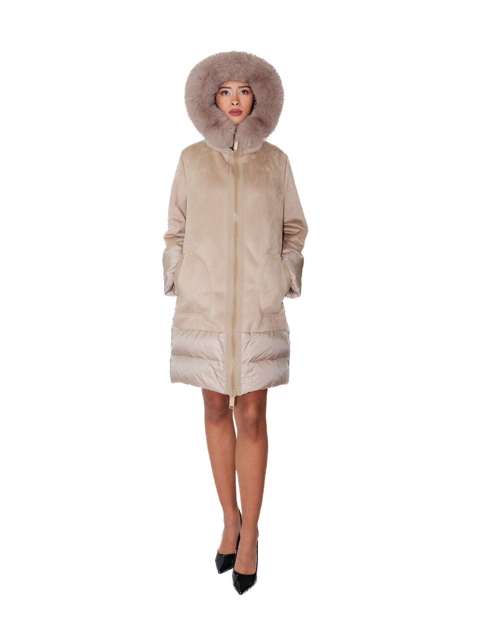 Cappotto realizzato con il retro in piumino di vera piuma e davanti in eco montone in colore tortora, si presenta con maniche in montone con polsi in piumino, cappuccio bordato in pelliccia di volpe mezzo piumino e mezzo montone, chiusura zip