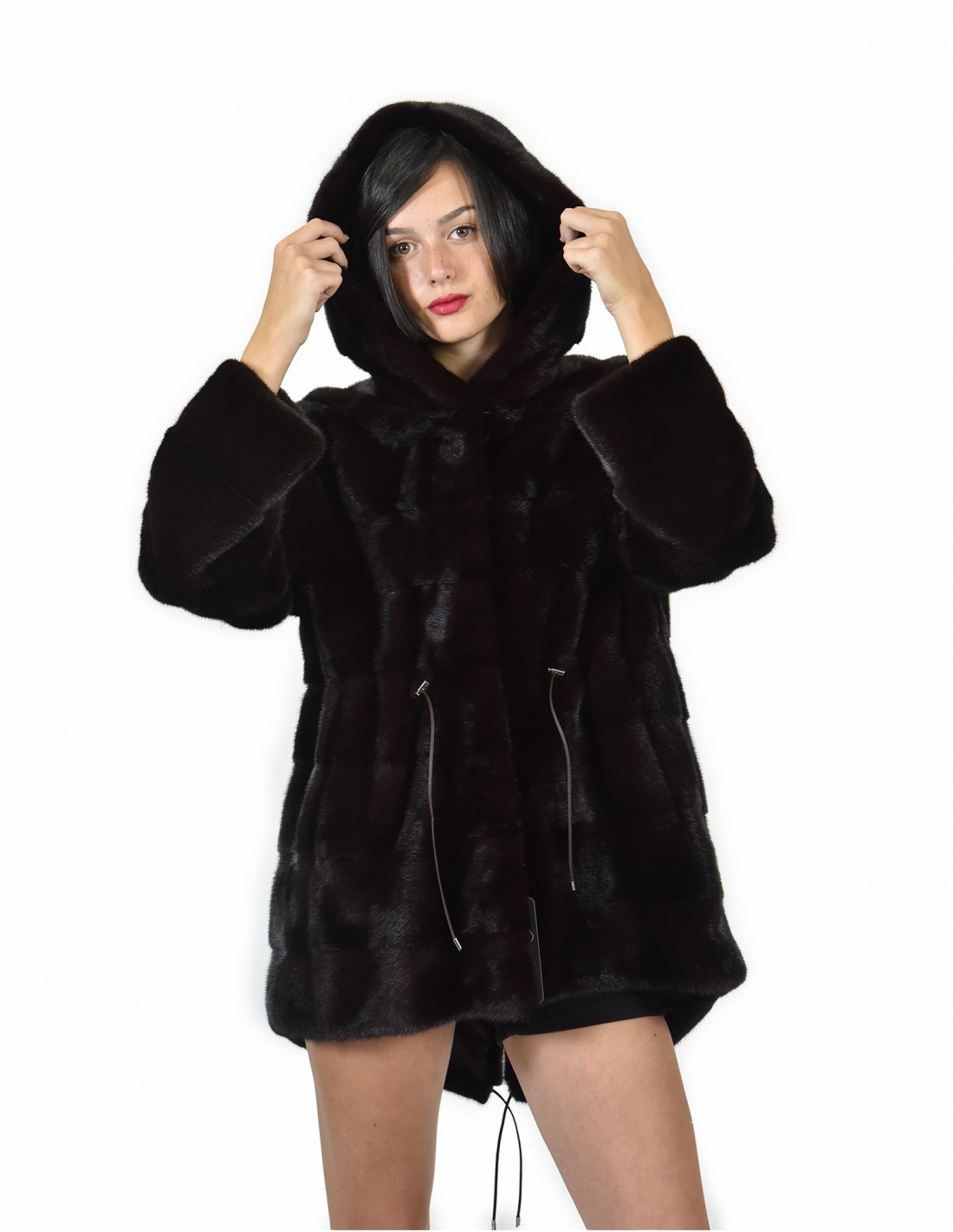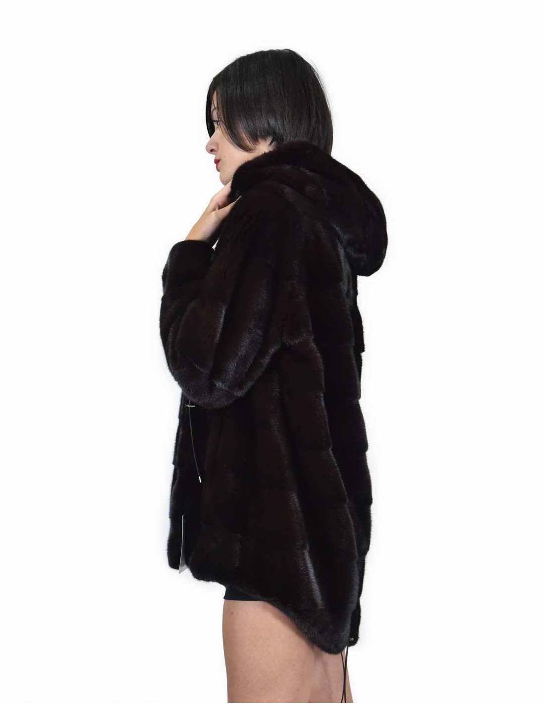 48 Giacca 80 centimetri colore cioccolato pelliccia visone pelle intera orizzontale cappuccio