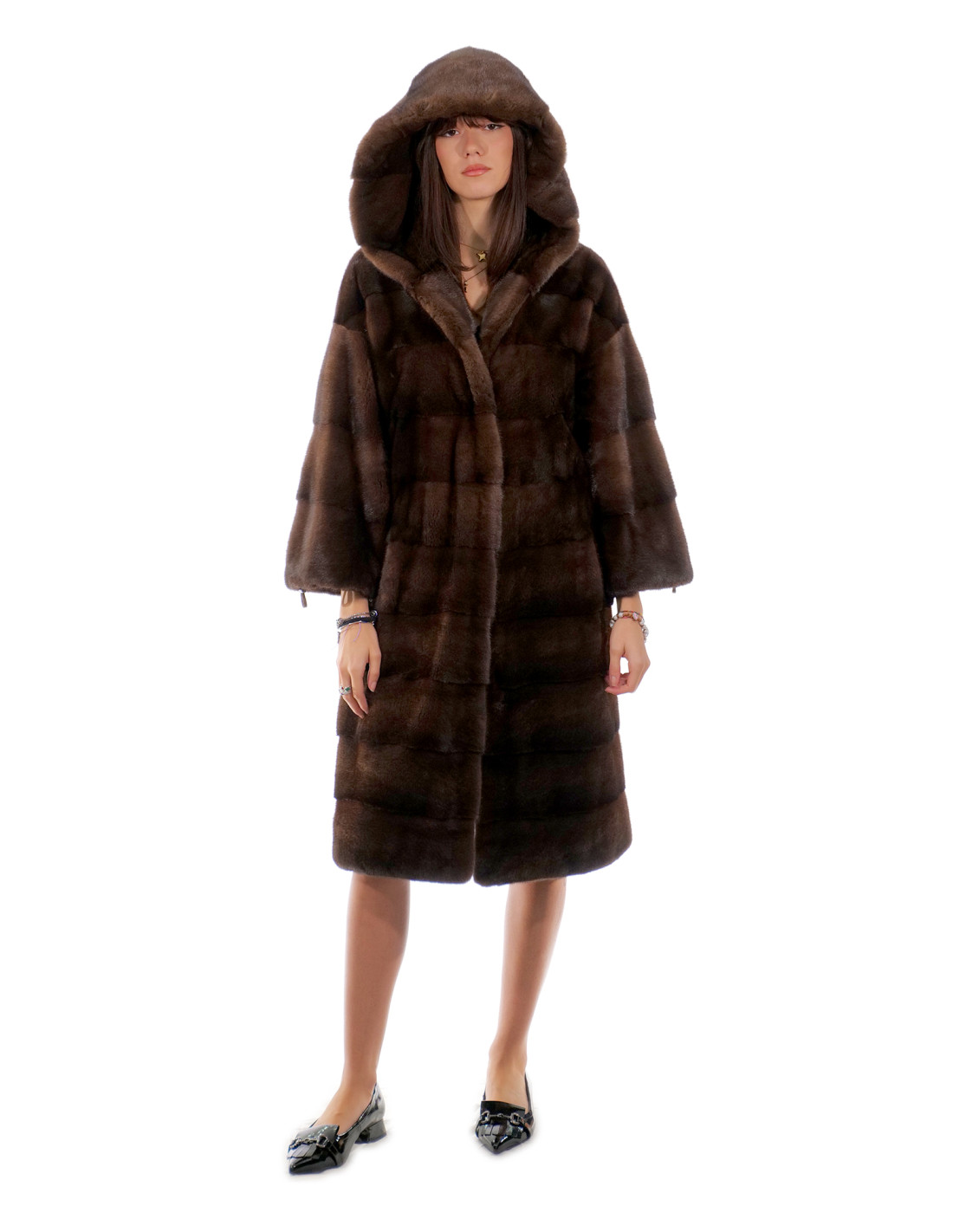 Cappotto 104 cm cappuccio scanbrown pelliccia 52 visone orizzontale coulisse fondo
