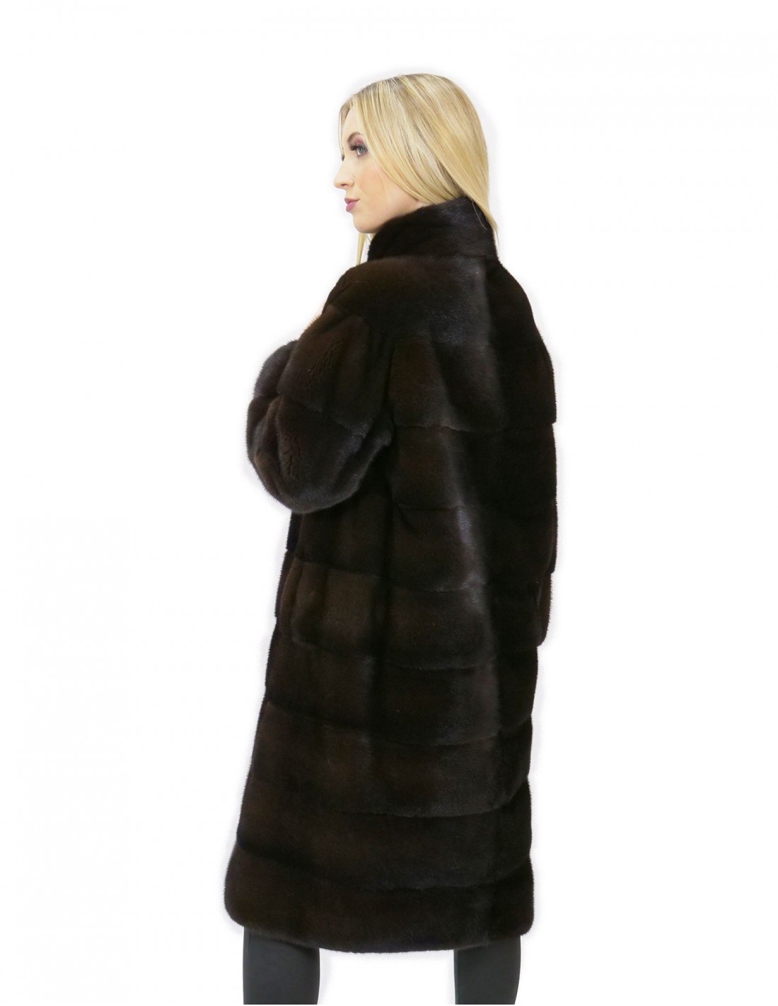 Cappotto di visone a pelli intere in lavorazione orizzontale. Le nostre pellicce di visone sono produzioni realizzate dei nostri laboratori, quindi un cappotto di visone unico ed esclusivo. La possibilità di produrre le nostre pellicce di altissima qualità ci consente di fare proposte a differenti prezzi con svariate occasioni a prezzi bassi sempre disponibili. Inoltre i nostri laboratori e le nostre collaborazioni garantiscono una pelliccia di visone di indiscussa qualità 100% made in italy. La qualità di pelliccia di visone femmina utilizzata per questo è un cappotto di pelliccia di visone con pelli siglate kopenhagen fur. Il cappotto di pelliccia di visone si presenta in uno splendido color mogano con un bellissimo collo pistagna, maniche a tre quarti, lungo ben 100 centimetri e tasche esterne normali.