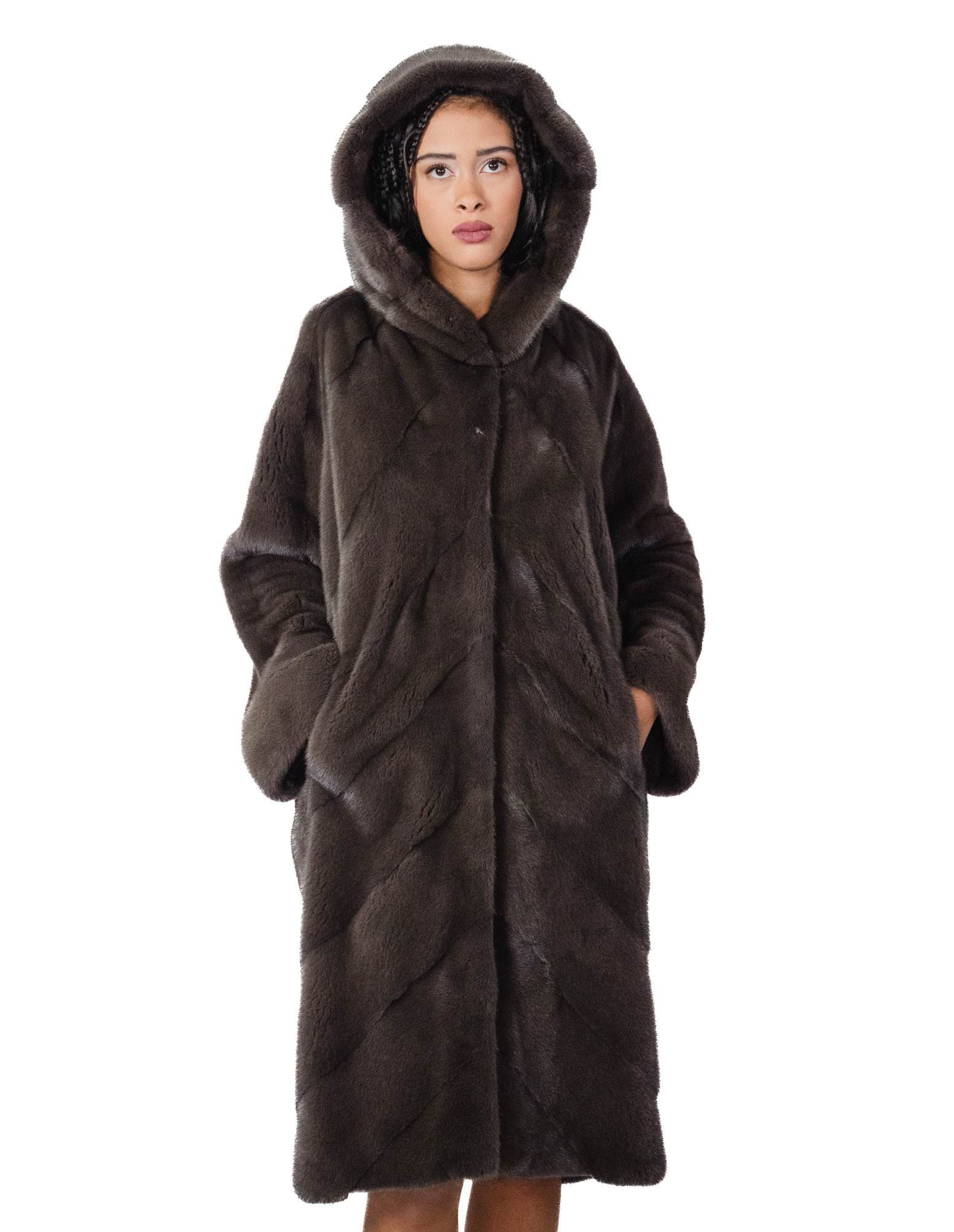 Cappotto pelliccia di visone lungo 112 centimetri 56 scanbrown marrone lavorato orizzontale a V cappuccio