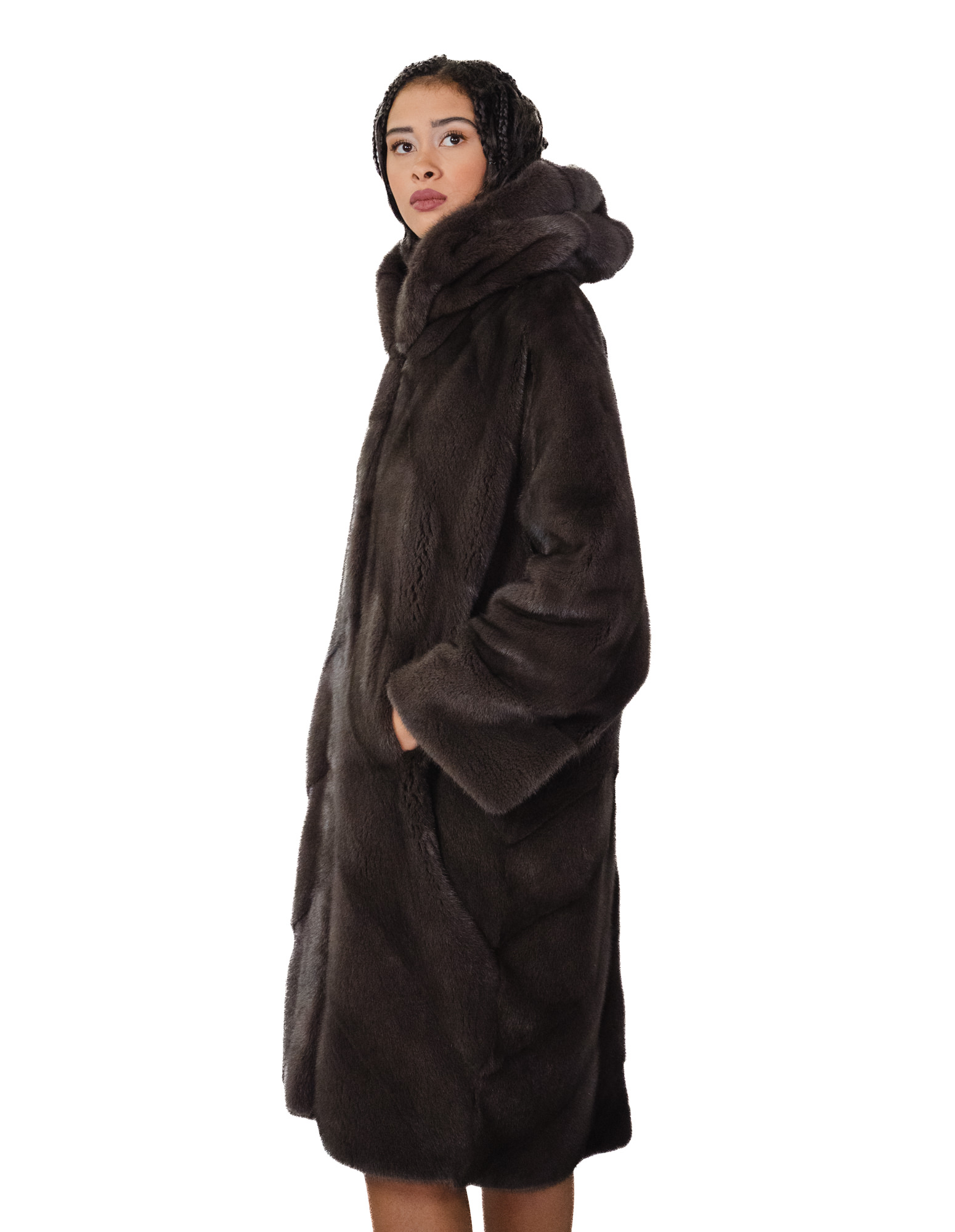 Home » Shop » Cappotto pelliccia di visone lungo 112 centimetri 52 coffee marrone lavorato orizzontale a V cappuccio