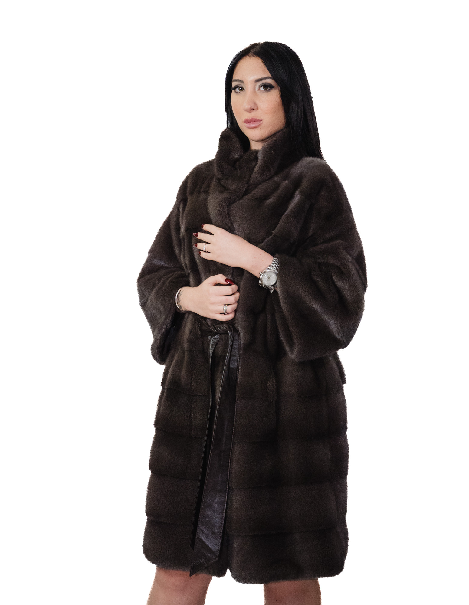 Cappotto in pelliccia di visone a pelli intere con lavorazione orizzontale. Le nostre pellicce di visone sono produzioni realizzate dei nostri laboratori, quindi una giacca di visone unica ed esclusiva. La possibilità di produrre le nostre pellicce di altissima qualità ci consente di fare proposte a differenti prezzi con svariate occasioni a prezzi bassi sempre disponibili. Inoltre i nostri laboratori e le nostre collaborazioni garantiscono una pelliccia di visone di indiscussa qualità 100% made in italy. La qualità di pelliccia di visone femmina utilizzata per questa è una giacca di pelliccia di visone con pelli siglate Manakas Frankfurt. La giacca di pelliccia di visone in lavorazione orizzontale lunga 96 centimetri, manica tre quarti a campana con cintura interna in pelle, chiusura con ganci interni, collo pistagna, modello a campana stretto sopra e largo sotto, il tutto colore coffee.
