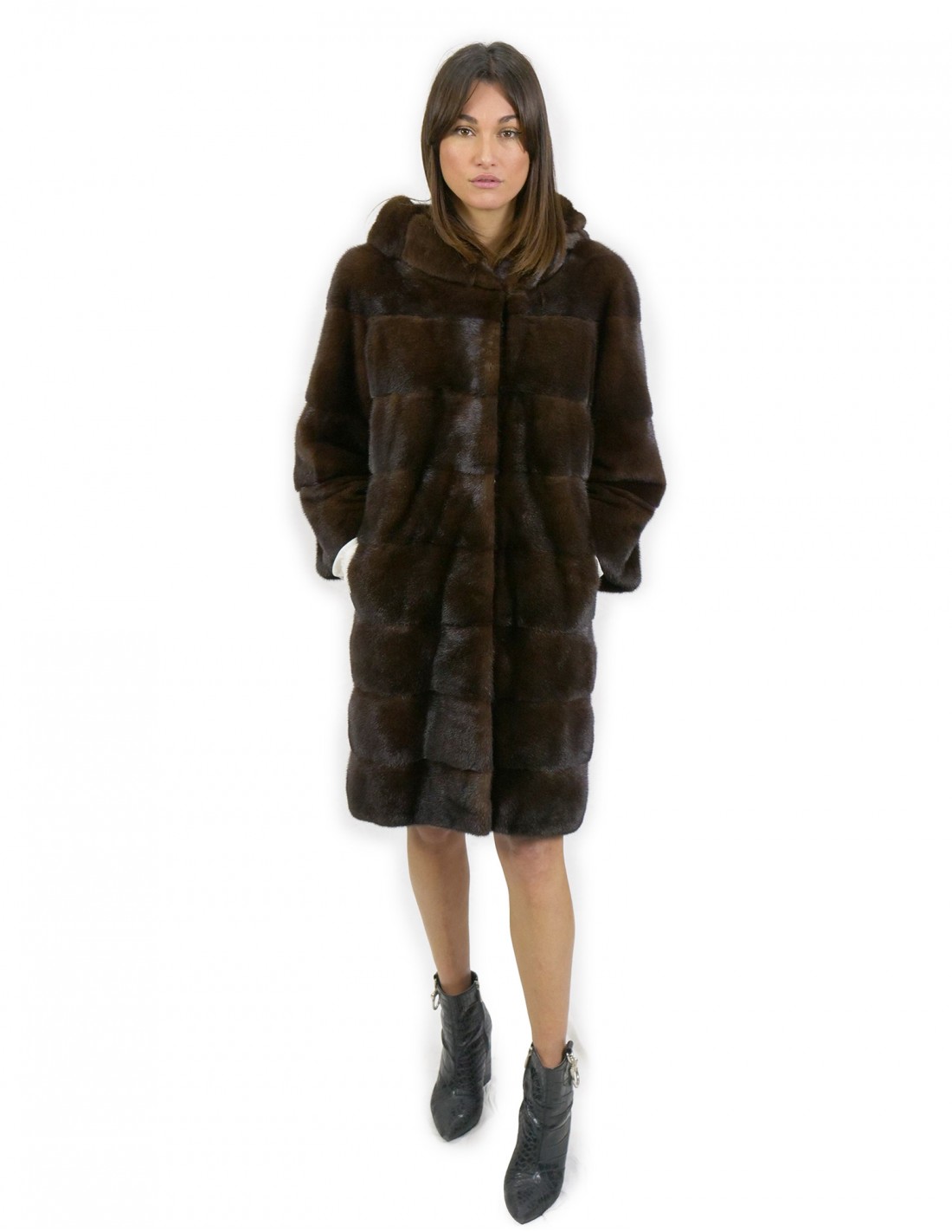 Cappotto di pelliccia di visone a pelli intere in lavorazione orizzontale. Le nostre pellicce di visone sono produzioni realizzate dei nostri laboratori, quindi un cappotto di visone unico ed esclusivo. La possibilità di produrre le nostre pellicce di altissima qualità ci consente di fare proposte a differenti prezzi con svariate occasioni a prezzi bassi sempre disponibili. Inoltre i nostri laboratori e le nostre collaborazioni garantiscono una pelliccia di visone di indiscussa qualità 100% made in italy. La qualità di pelliccia di visone femmina utilizzata per questa è un cappotto di pelliccia di visone con pelli siglate Kopenaghen Furs. Il cappotto di pelliccia di visone si presenta in lavorazione orizzontale con tasche esterne, con chiusura ganci e cappuccio foderato in pelliccia di visone, manica 3/4, tutto in colore mogano.