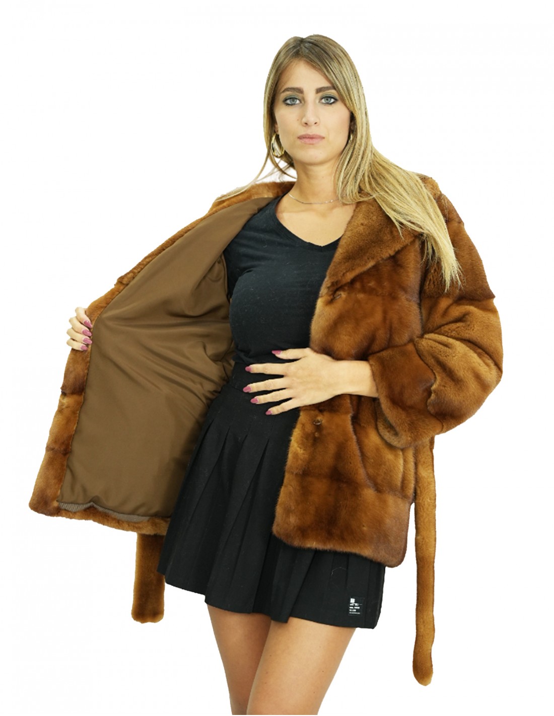 Giacca in pelliccia di visone a pelli intere orizzontali di colore gold scuro con collo petto e bavero e cintura foderati in pelliccia. Le nostre pellicce di visone sono produzioni realizzate dei nostri laboratori, quindi una giacca di visone unica ed esclusiva. La possibilità di produrre le nostre pellicce di altissima qualità ci consente di fare proposte a differenti prezzi con svariate occasioni a prezzi bassi sempre disponibili. Inoltre i nostri laboratori e le nostre collaborazioni garantiscono una pelliccia di visone di indiscussa qualità 100% made in italy. La qualità di pelliccia di visone femmina utilizzata per questa è una giacca di pelliccia di visone con pelli siglate Kopenaghen furs. La giacca di pelliccia di visone in lavorazione orizzontale lunga 70 centimetri, manica lunga, chiusura con ganci interni e cintura in pelliccia di visone in vita il tutto color gold scuro