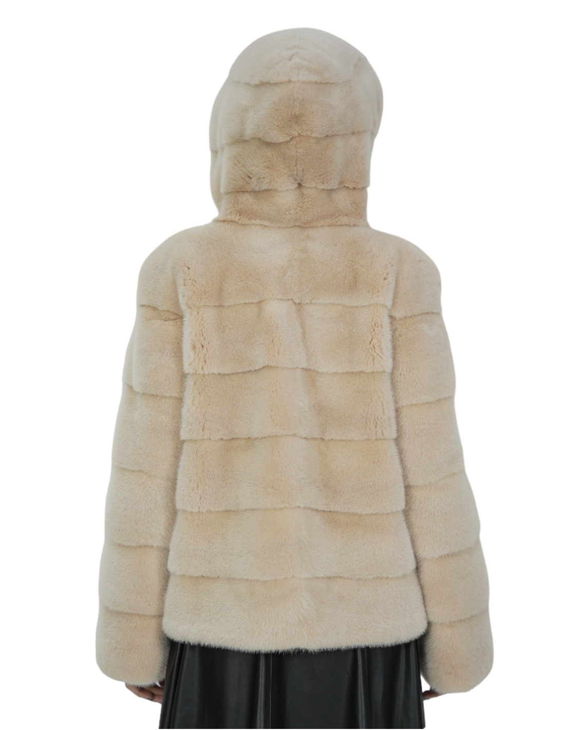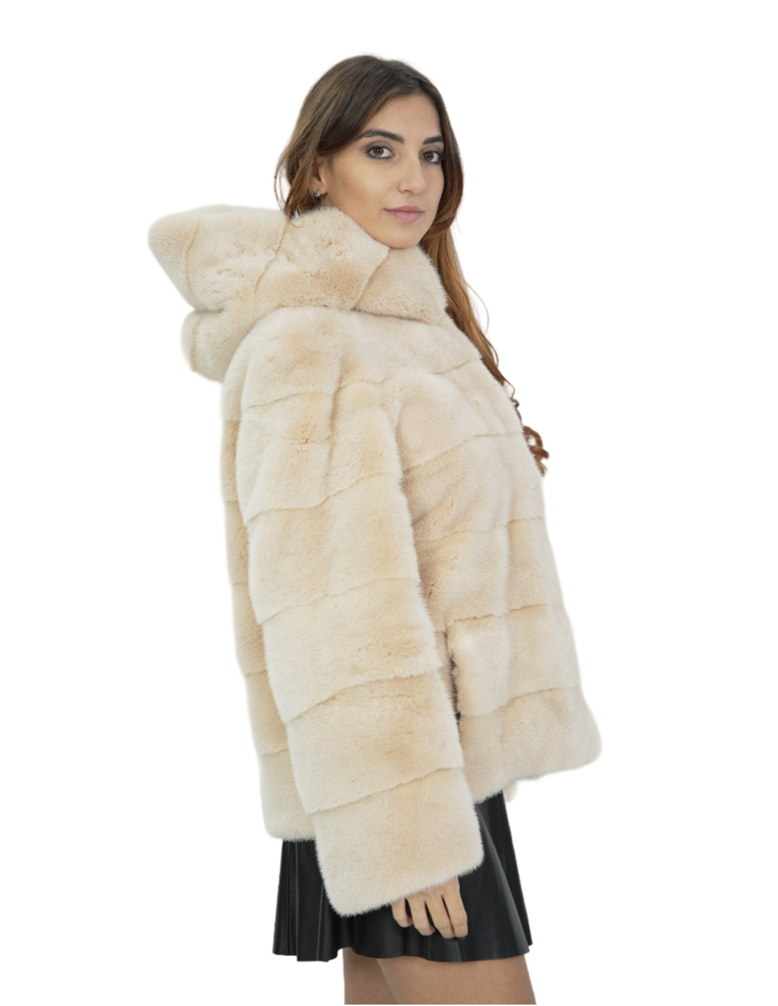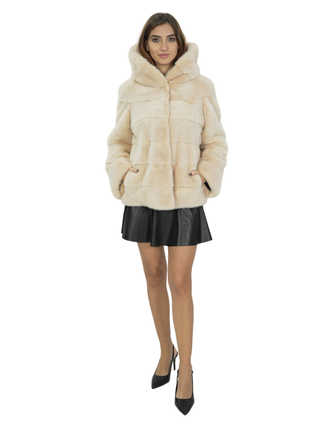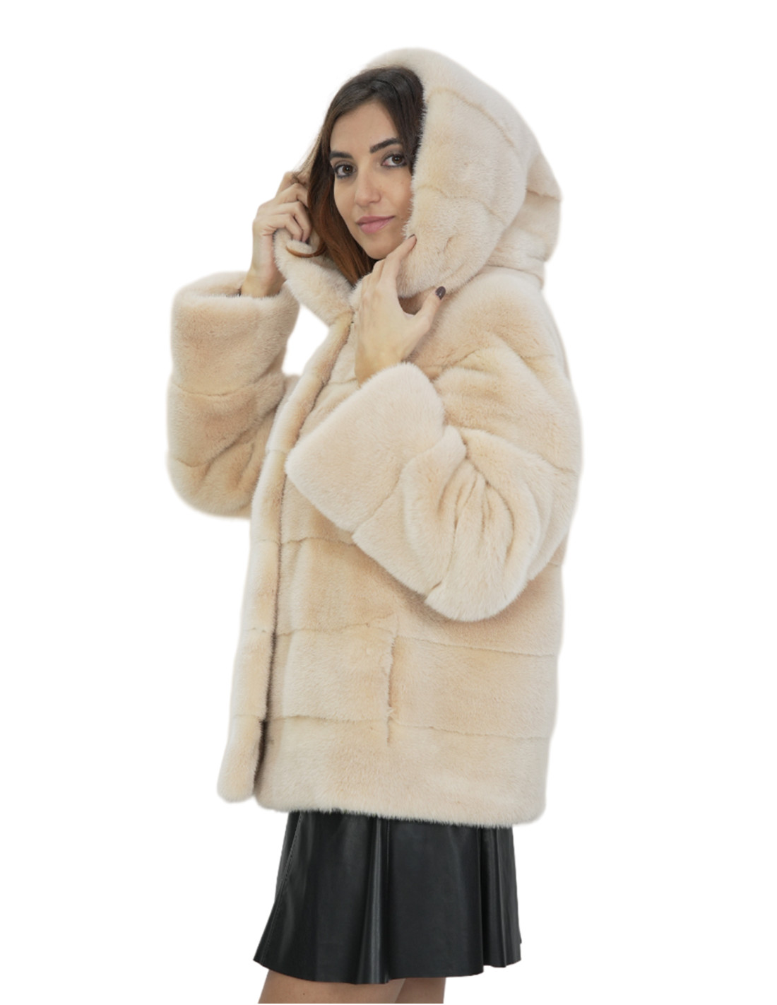Giacca di visone a pelli intere in lavorazione orizzontale. Le nostre pellicce di visone sono produzioni realizzate dei nostri laboratori, quindi una giacca di visone unica ed esclusiva. La possibilità di produrre le nostre pellicce di altissima qualità ci consente di fare proposte a differenti prezzi con svariate occasioni a prezzi bassi sempre disponibili. Inoltre i nostri laboratori e le nostre collaborazioni garantiscono una pelliccia di visone di indiscussa qualità 100% made in italy. La qualità di pelliccia di visone femmina utilizzata per questa è una giacca di pelliccia di visone con pelli siglate Kopenaghen furs. La giacca di pelliccia di visone in lavorazione orizzontale lunga 62 centimetri si presenta con tasche esterne, chiusura ganci e cappuccio con pelliccia di visone anche internamente, manica lunga, il tutto in colore beige.