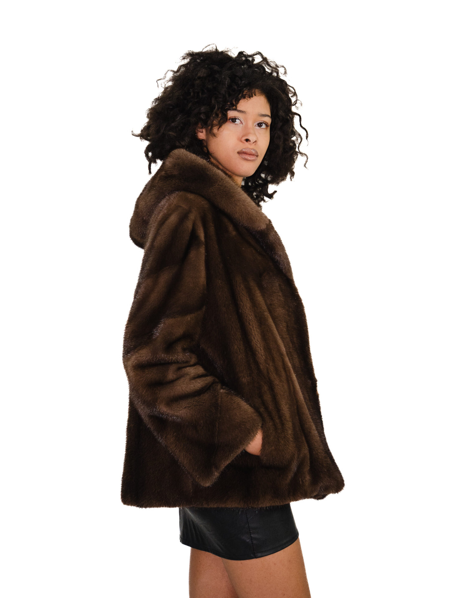 Giacca visone demi cappuccio pelliccia donna 50 pelle intera e maniche a V coulisse vita chiusura ganci