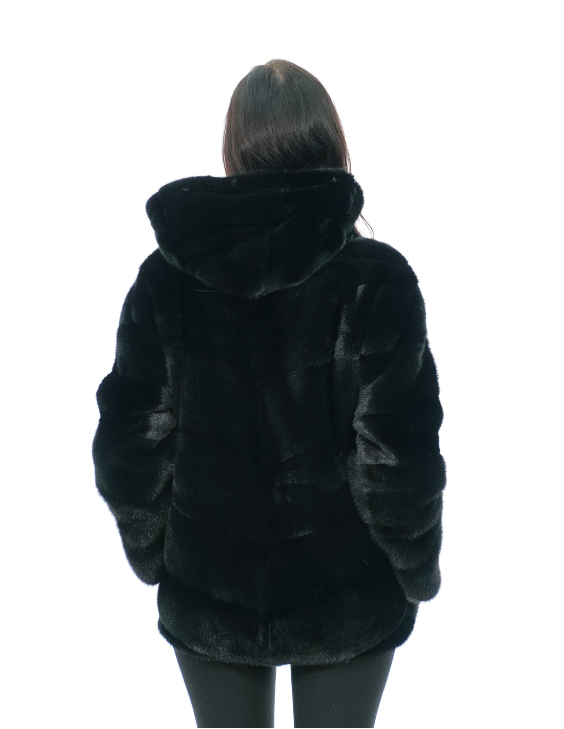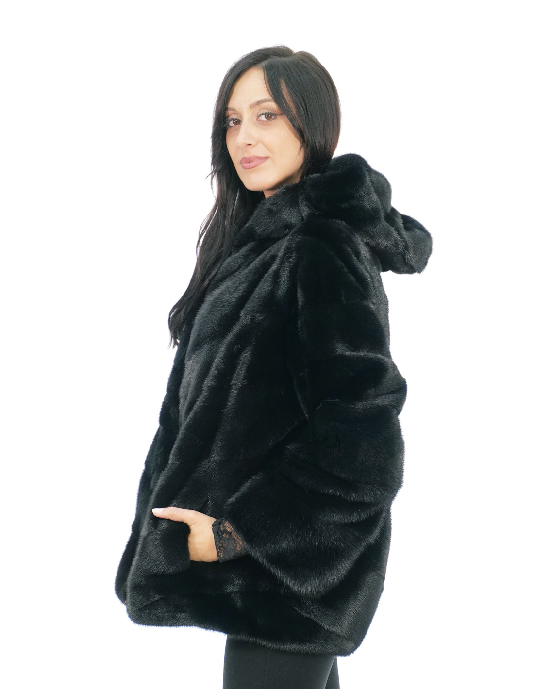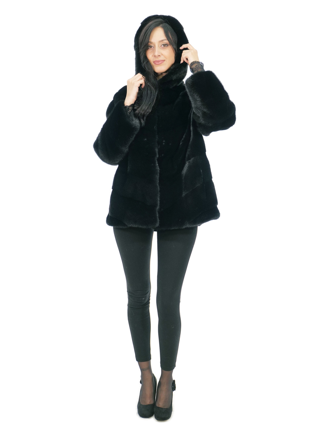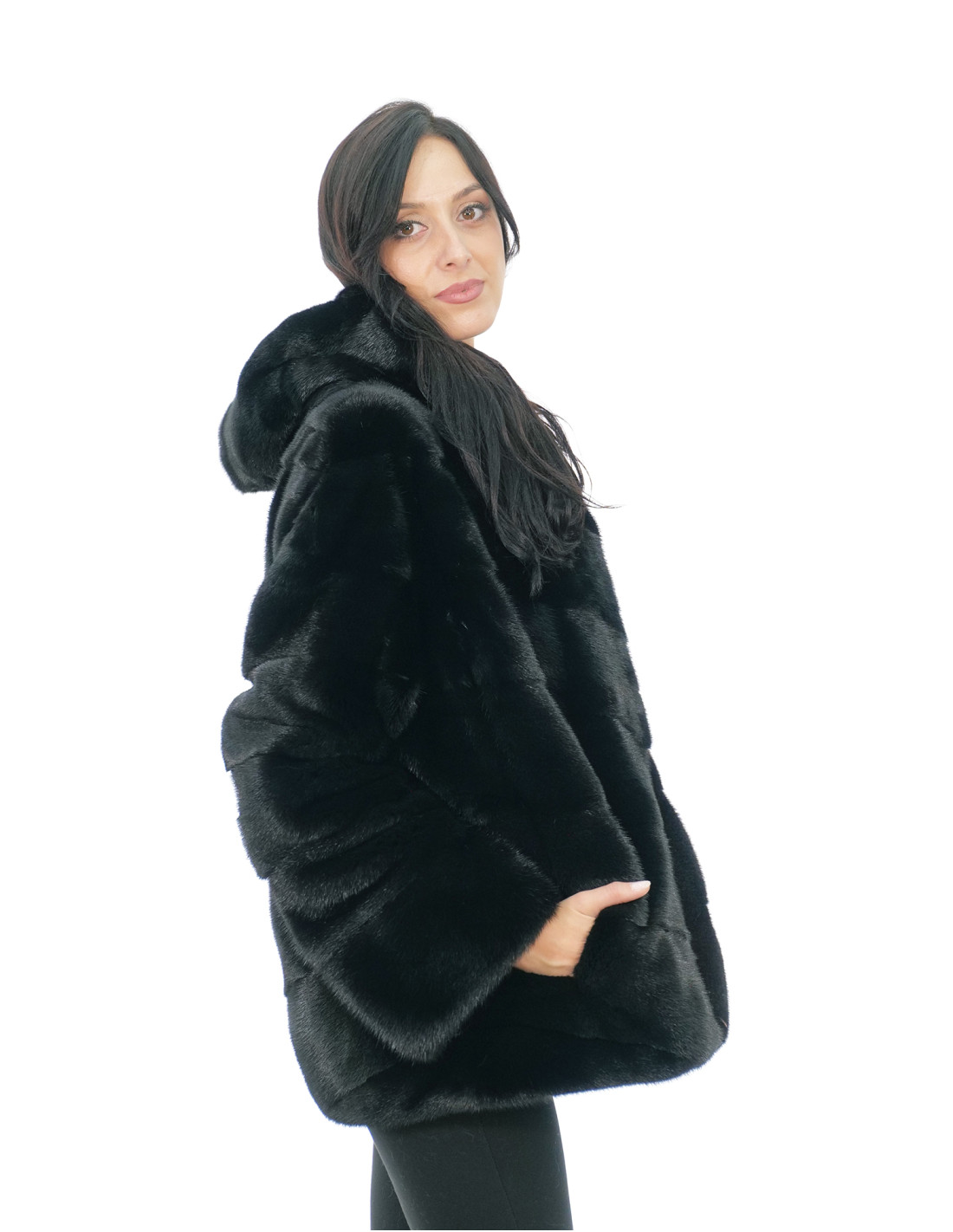 Home » Shop » Giacca visone nero orizzontale a V pelliccia 50 manica lunga cappuccio foderato pelli visone ganci