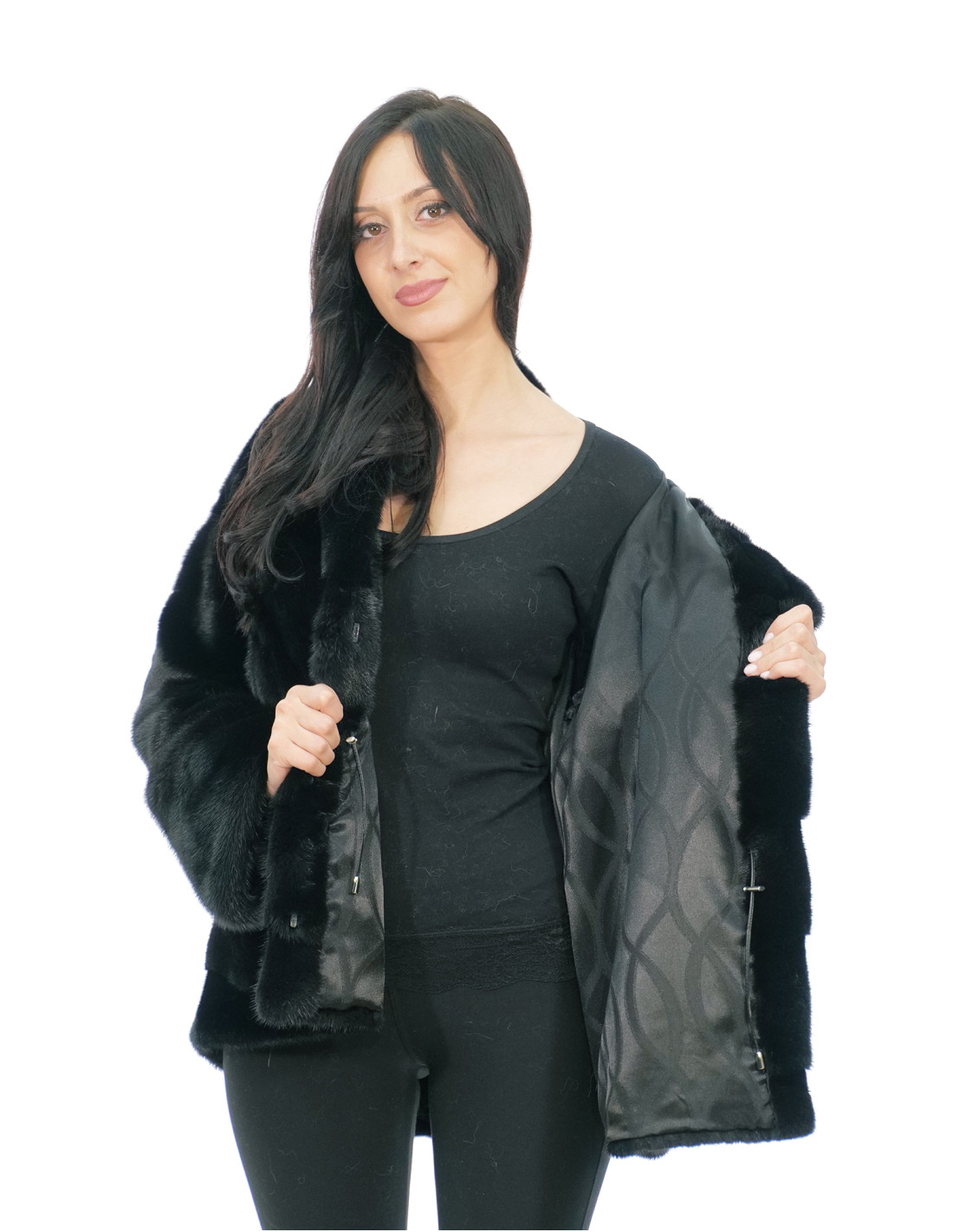 Giacca visone nero orizzontale a V pelliccia 50 manica lunga cappuccio foderato pelli visone ganci