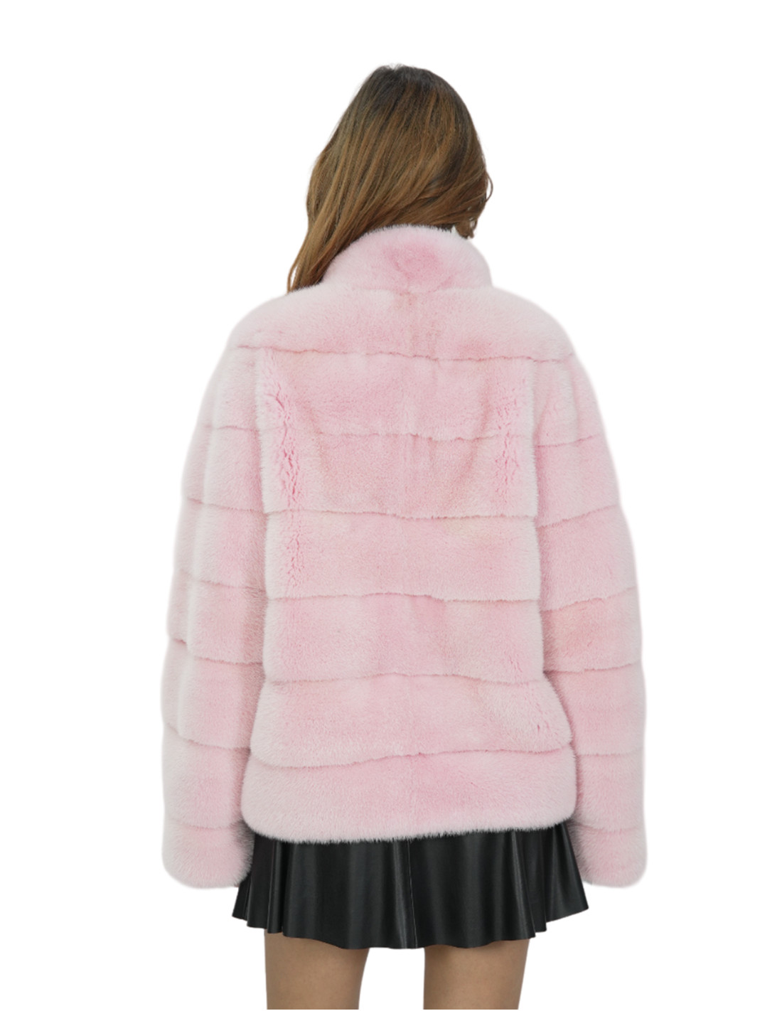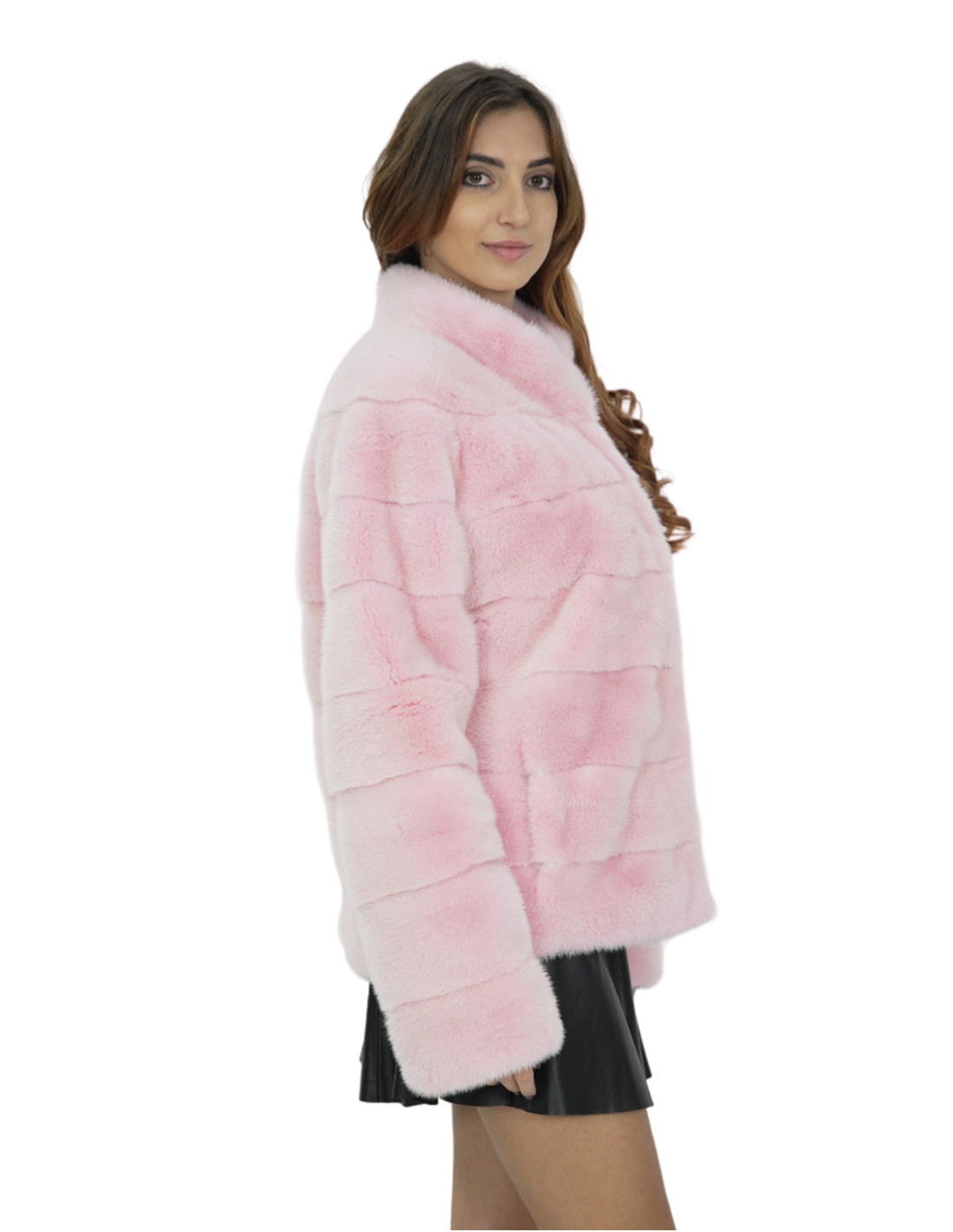 Giacca di visone a pelli intere in lavorazione orizzontale. Le nostre pellicce di visone sono produzioni realizzate dei nostri laboratori, quindi una giacca di visone unica ed esclusiva. La possibilità di produrre le nostre pellicce di altissima qualità ci consente di fare proposte a differenti prezzi con svariate occasioni a prezzi bassi sempre disponibili. Inoltre i nostri laboratori e le nostre collaborazioni garantiscono una pelliccia di visone di indiscussa qualità 100% made in italy. La qualità di pelliccia di visone femmina utilizzata per questa è una giacca di pelliccia di visone con pelli siglate Kopenaghen furs. La giacca di pelliccia di visone in lavorazione orizzontale lunga 64 centimetri si presenta con tasche esterne, chiusura ganci e collo pistagna, manica lunga, il tutto in colore rosa.