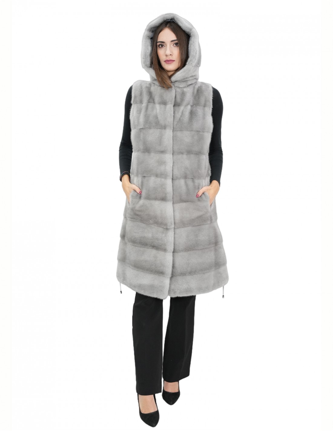 Gilet 94 cm grigio zaffiro visone orizzontale donna 42 pelliccia cappuccio coulisse