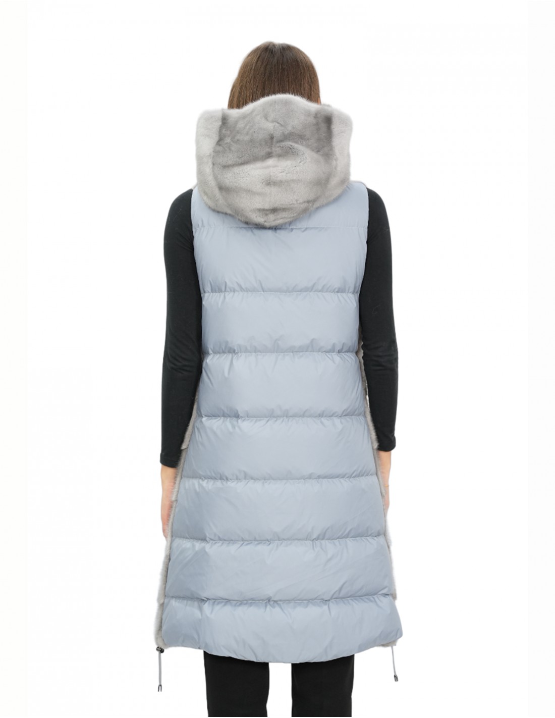 Gilet di visone a pelli intere in lavorazione orizzontale e piumino. Le nostre pellicce di visone sono produzioni realizzate dei nostri laboratori, quindi un gilet di visone unico ed esclusivo. La possibilità di produrre le nostre pellicce di altissima qualità ci consente di fare proposte a differenti prezzi con svariate occasioni a prezzi bassi sempre disponibili. Inoltre i nostri laboratori e le nostre collaborazioni garantiscono una pelliccia di visone di indiscussa qualità 100% made in italy. La qualità di pelliccia di visone femmina utilizzata per questa è un gilet di pelliccia di visone con pelli siglate Kopenhagen fur. Il gilet di pelliccia di visone si presenta in lavorazione orizzontale, la parte posteriore in piumino morbidissimo con vera piuma in uno splendido color zaffiro, il modello leggermente a campana ha sul fondo una comoda coulisse per trasformare la vestibilità, con un bellissimo cappuccio con pelliccia di visone esternamente e con piumino internamente, chiusura a ganci e tasche esterne normali.