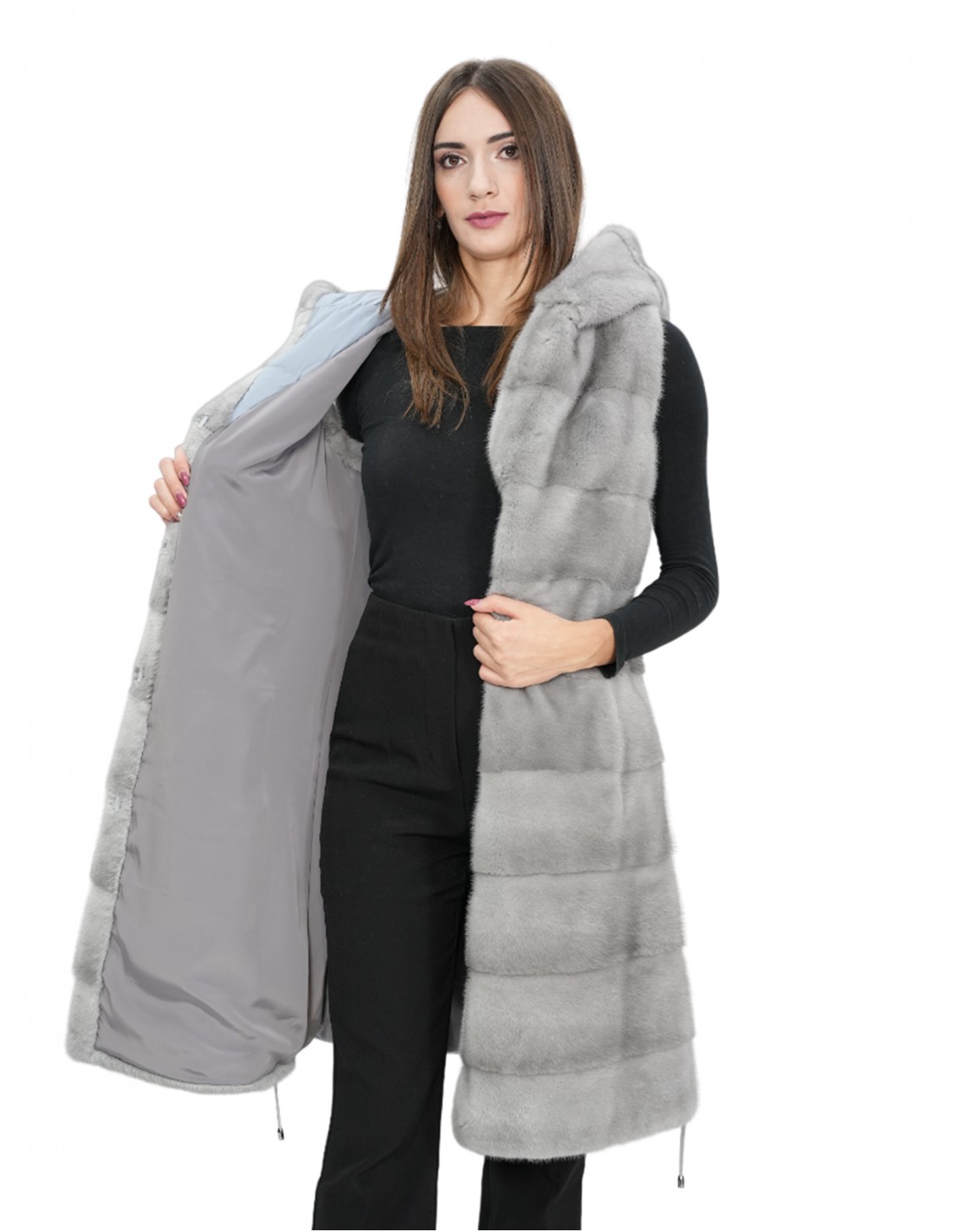 Gilet 94 cm grigio zaffiro visone orizzontale donna 50 pelliccia cappuccio coulisse