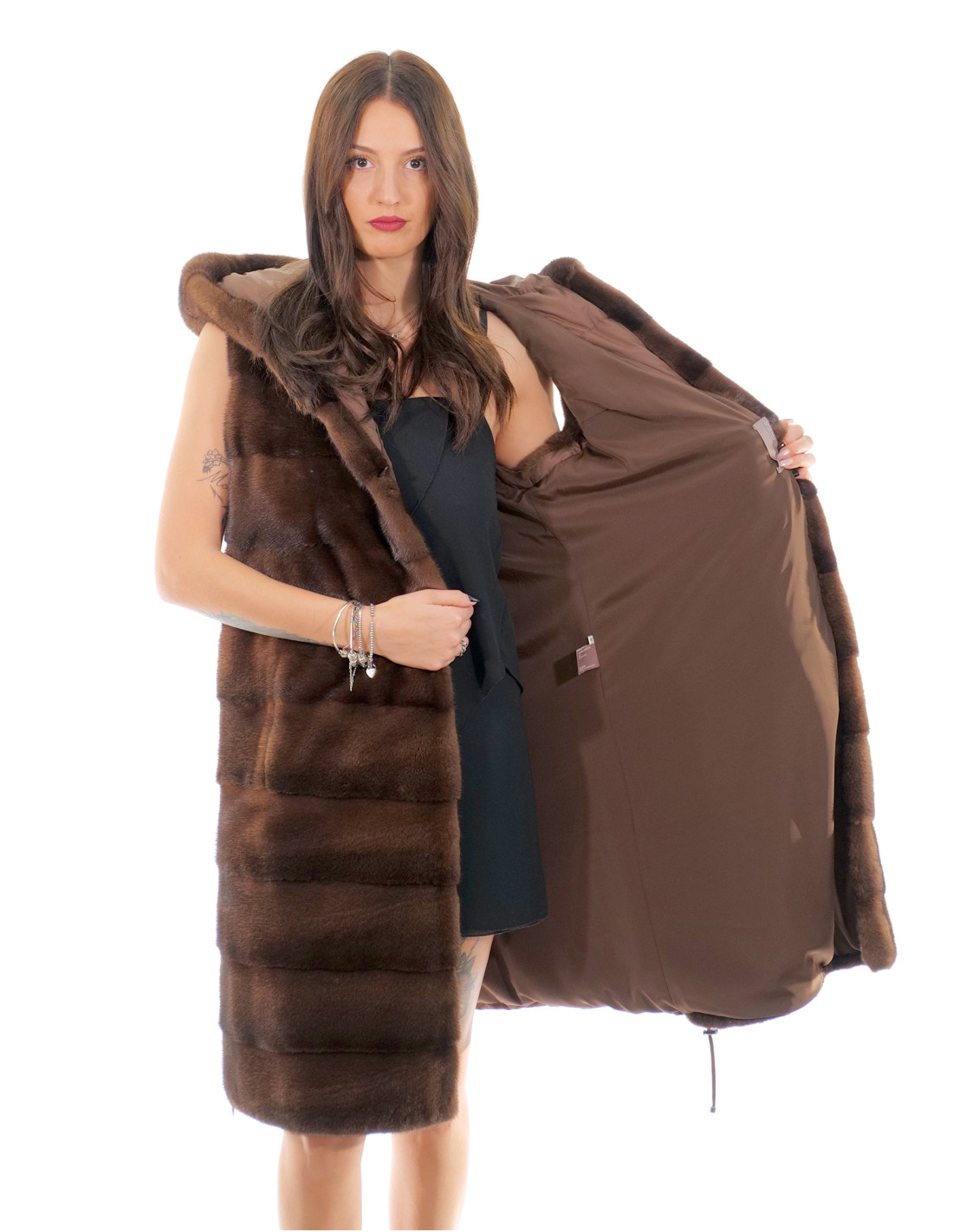Home » Shop » Gilet 94 cm scanbrown visone orizzontale e piumino 54 pelliccia cappuccio coulisse