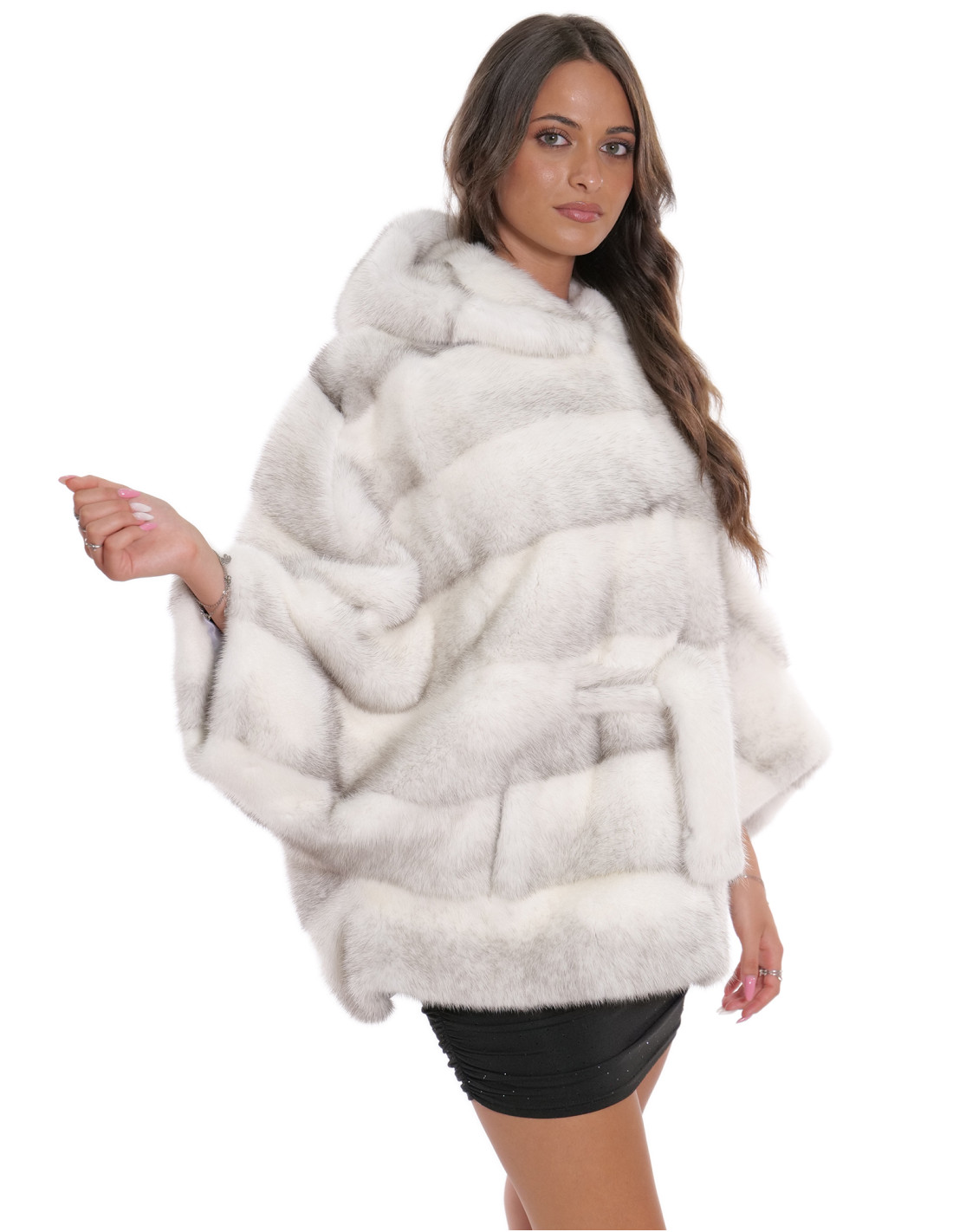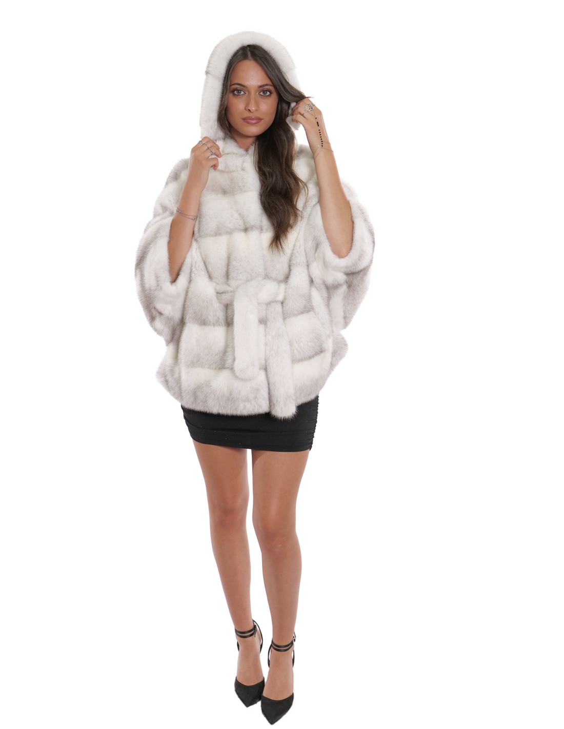 Mantella con cintura in pelliccia bianco brinato visone 48/54 con lavorazione orizzontale a pelle intera con cappuccio