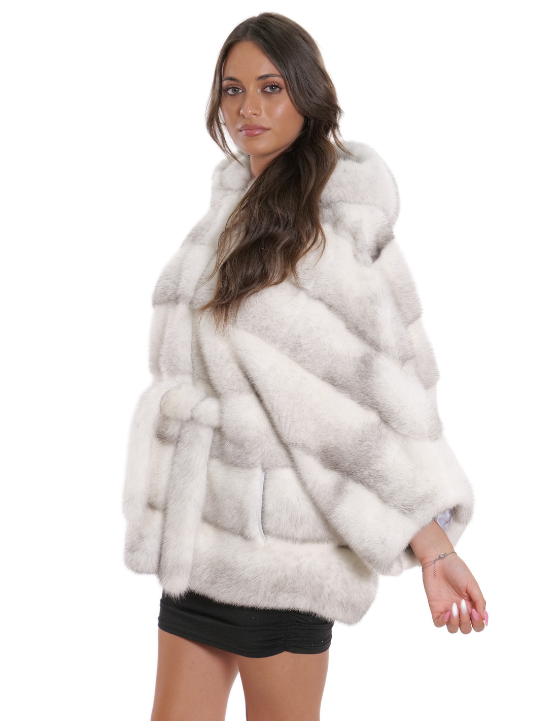 Mantella di visone a pelli intere orizzontali con cintura in pelliccia vita. Le nostre pellicce di visone sono produzioni realizzate dei nostri laboratori, quindi una giacca di visone unica ed esclusiva. La possibilità di produrre le nostre pellicce di altissima qualità ci consente di fare proposte a differenti prezzi con svariate occasioni a prezzi bassi sempre disponibili. Inoltre i nostri laboratori e le nostre collaborazioni garantiscono una pelliccia di visone di indiscussa qualità 100% made in italy. La qualità di pelliccia di visone femmina utilizzata per questa è una giacca di pelliccia di visone con pelli siglate Saga Furs. La mantella di pelliccia di visone in lavorazione orizzontale lunga 72 centimetri, manica 3/4, chiusura con ganci interni e cappuccio foderato in pelli di visone, cintura in vita in pelliccia, il tutto in colore bianco sfumato marrone definito “brinato”.