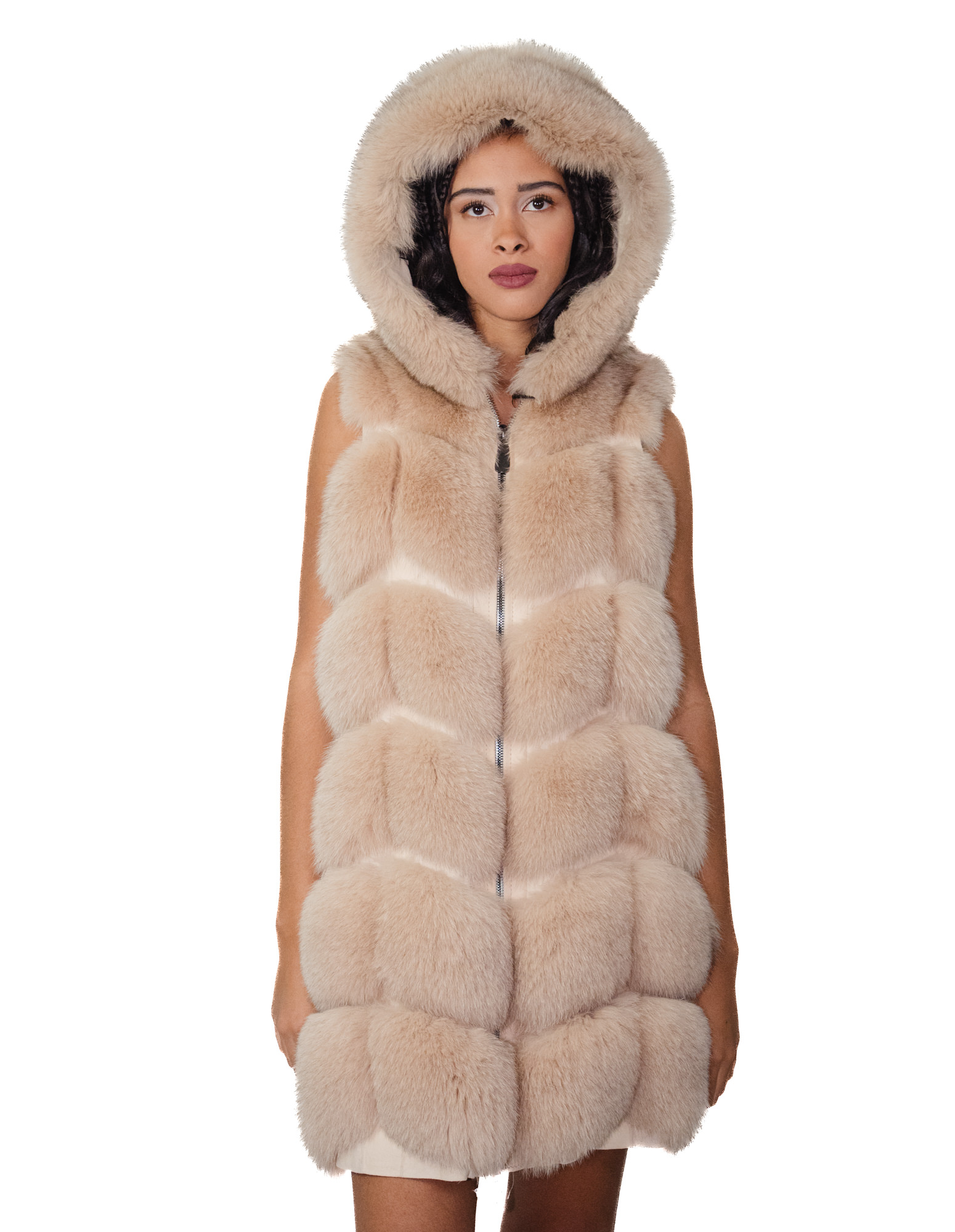 Gilet in pelliccia di volpe a pelli intere in lavorazione a V. Le nostre pellicce di volpe sono produzioni realizzate dei nostri laboratori, quindi una giacca di volpe unica ed esclusiva. La possibilità di produrre le nostre pellicce di altissima qualità ci consente di fare proposte a differenti prezzi con svariate occasioni a prezzi bassi sempre disponibili. Inoltre i nostri laboratori e le nostre collaborazioni garantiscono una pelliccia di volpe di indiscussa qualità 100% made in italy. La qualità di pelliccia di volpe utilizzata per questa è un gilet di pelliccia di volpe con pelli siglate Manakas. Il gilet di pelliccia lungo ben 86 centimetri di volpe e inserimento di pelle vera si presenta con tasche esterne, chiusura zip e cappuccio foderato in pelliccia e il tutto in colore beige ecru.